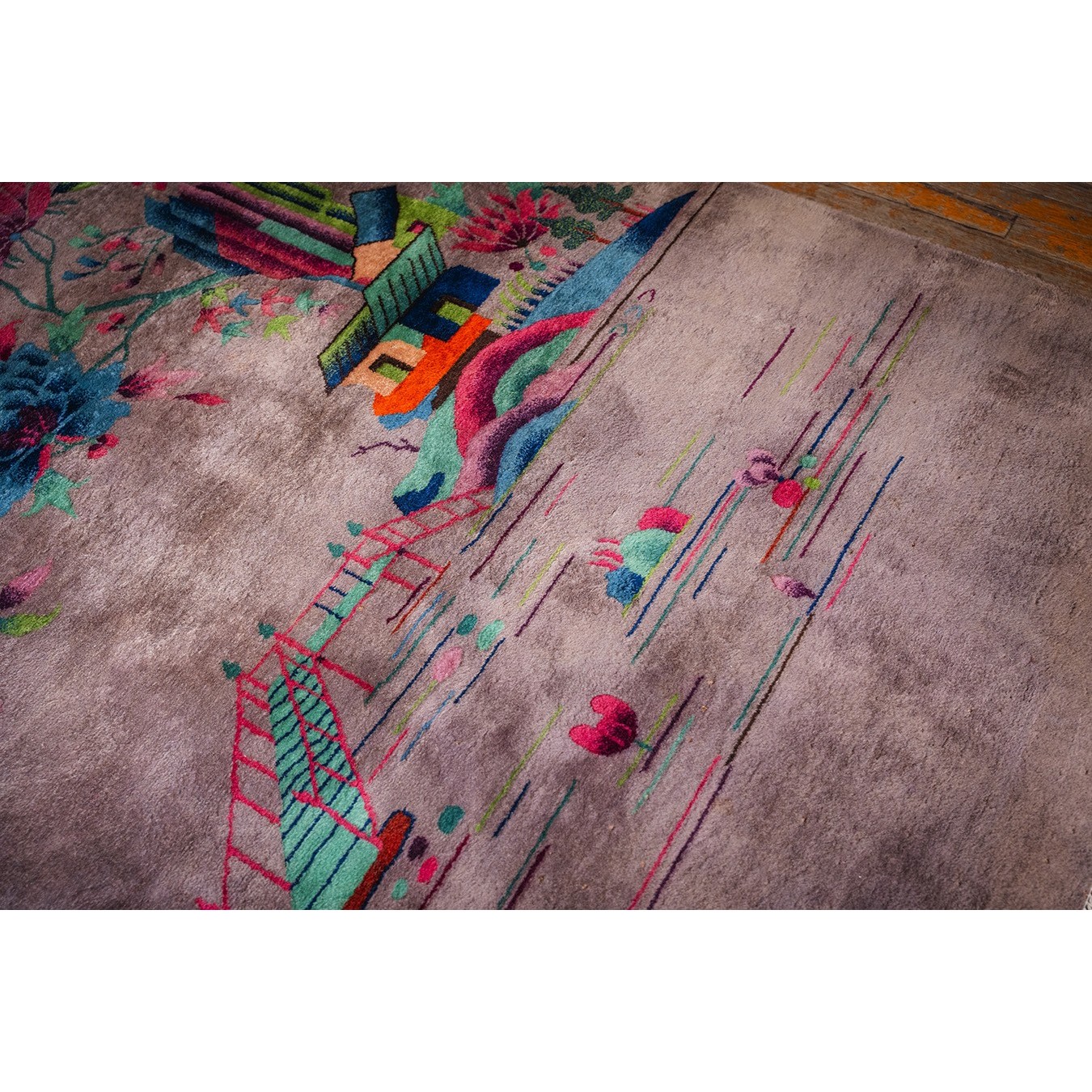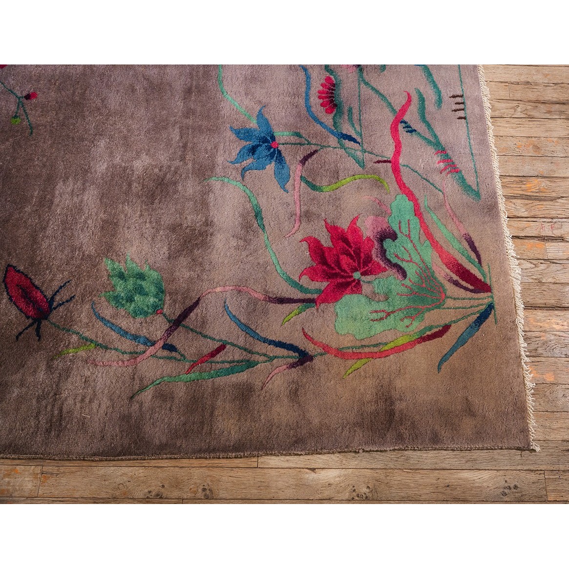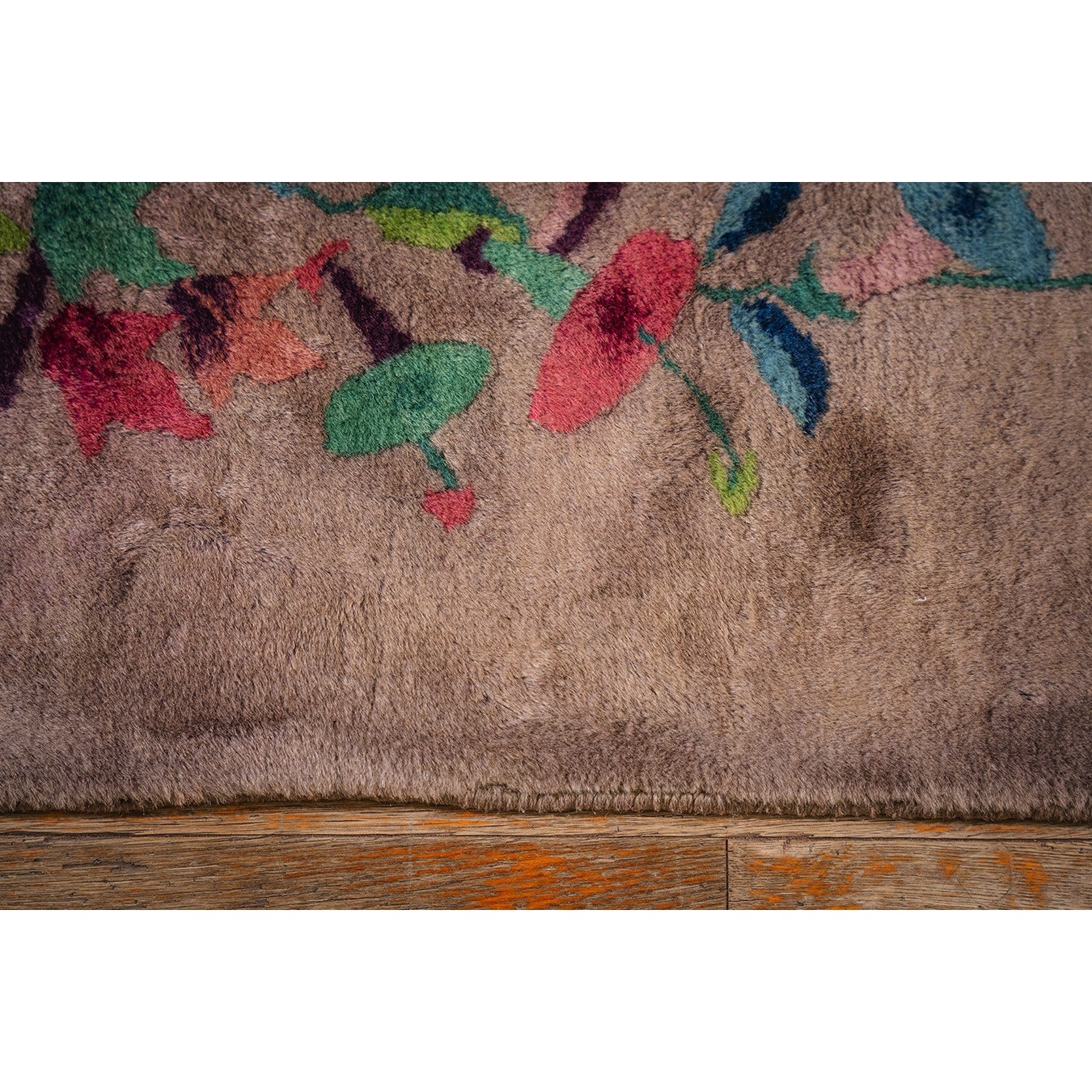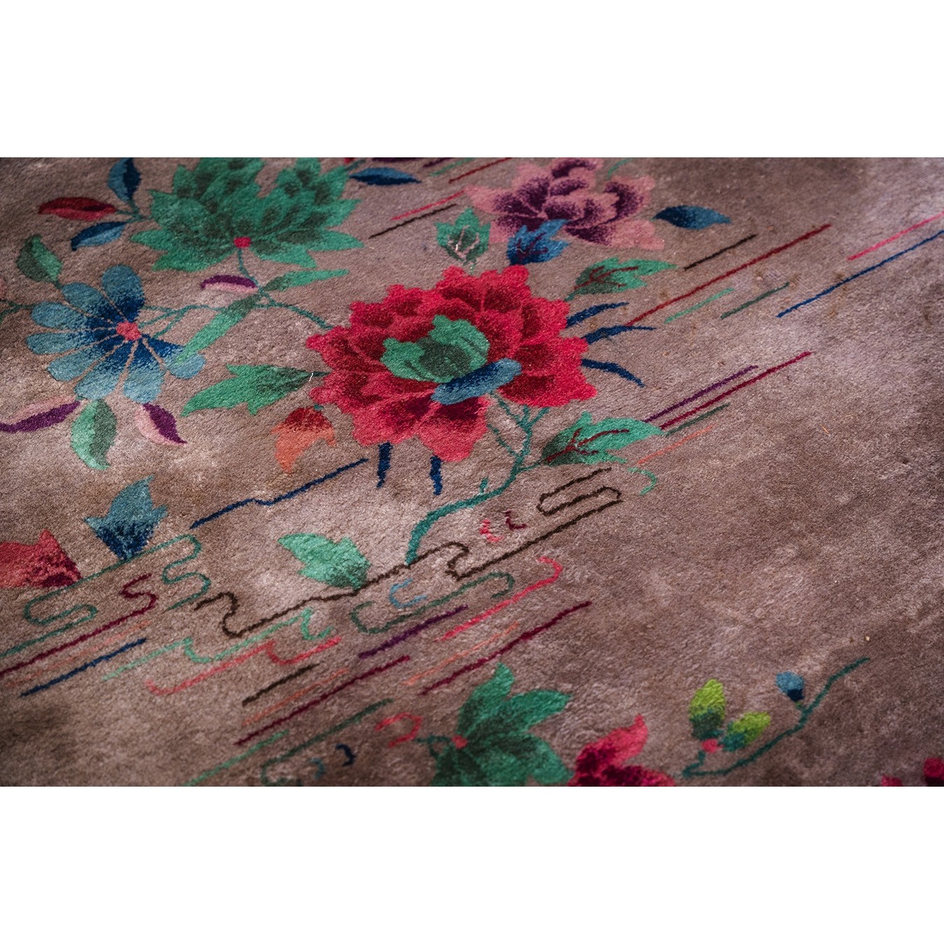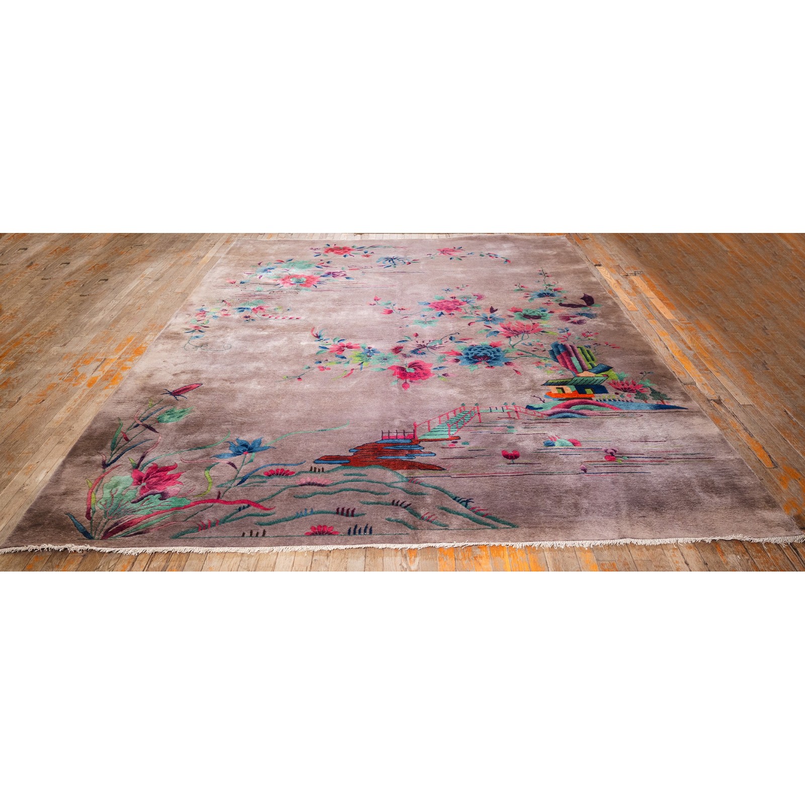 DescriptionChineseCarpets made in China proper. See entries Ningshia, Peking, Art Deco. Chinese - Art DecoAs the name implies, pieces woven between the wars for the Western market by mostly American owned firms especially Nichols and Fette, in thick heavy weaves using strong colors, asymmetric patterns and downplaying the Chinese-ness of the carpet. Nichols rugs are more strong toned than the pastel Fette. Most were woven in the coastal port city of Tientsin. Other lesser known workshops were also active. Some pieces are ultra-geometric and haute-Deco moderne in character: these are very rare. More frequent are pieces with bits of Chinese ornament: vases or other precious objects, paeonies, vines, fences, etc. Most common is the 9 x 12 size, in colors never found in mainstream Chinese rugs: backgrounds in black, mauve, purple, hot pink, orange, olive, employing the best synthetic chrome dyes of the period. Prices are still reasonable and carpets in top condition are available. | |