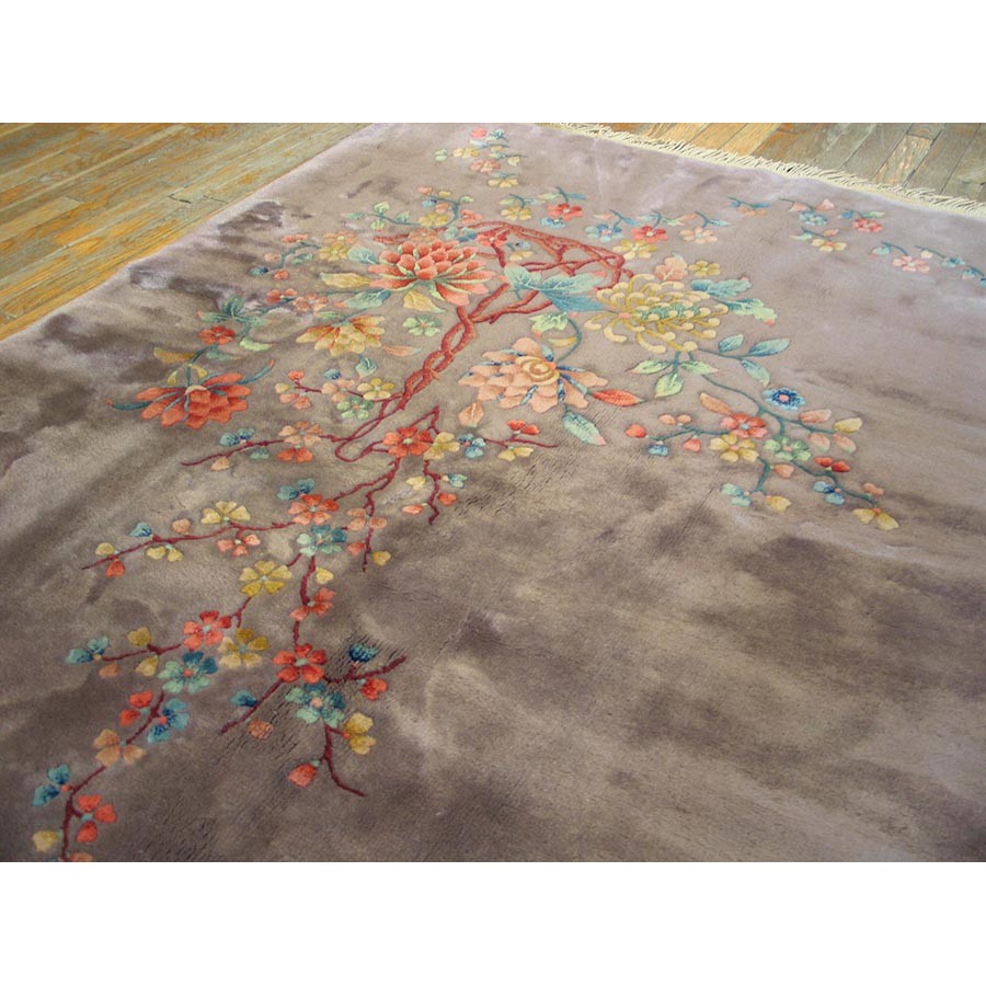 DescriptionChineseCarpets made in China proper. See entries Ningshia, Peking, Art Deco. Chinese - Art DecoAs the name implies, pieces woven between the wars for the Western market by mostly American owned firms especially Nichols and Fette, in thick heavy weaves using strong colors, asymmetric patterns and downplaying the Chinese-ness of the carpet. Nichols rugs are more strong toned than the pastel Fette. Most were woven in the coastal port city of Tientsin. Other lesser known workshops were also active. Some pieces are ultra-geometric and haute-Deco moderne in character: these are very rare. More frequent are pieces with bits of Chinese ornament: vases or other precious objects, paeonies, vines, fences, etc. Most common is the 9 x 12 size, in colors never found in mainstream Chinese rugs: backgrounds in black, mauve, purple, hot pink, orange, olive, employing the best synthetic chrome dyes of the period. Prices are still reasonable and carpets in top condition are available. | |
