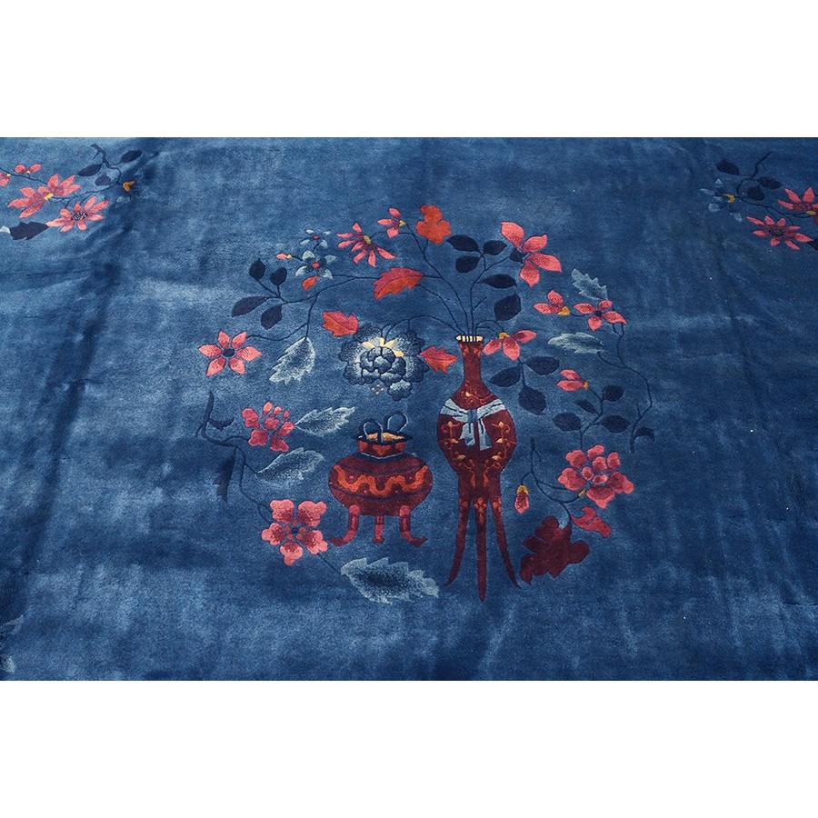 DescriptionChineseCarpets made in China proper. See entries Ningshia, Peking, Art Deco. Chinese - Art DecoAs the name implies, pieces woven between the wars for the Western market by mostly American owned firms especially Nichols and Fette, in thick heavy weaves using strong colors, asymmetric patterns and downplaying the Chinese-ness of the carpet. Nichols rugs are more strong toned than the pastel Fette. Most were woven in the coastal port city of Tientsin. Other lesser known workshops were also active. Some pieces are ultra-geometric and haute-Deco moderne in character: these are very rare. More frequent are pieces with bits of Chinese ornament: vases or other precious objects, paeonies, vines, fences, etc. Most common is the 9 x 12 size, in colors never found in mainstream Chinese rugs: backgrounds in black, mauve, purple, hot pink, orange, olive, employing the best synthetic chrome dyes of the period. Prices are still reasonable and carpets in top condition are available. | |