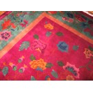 DescriptionChineseCarpets made in China proper. See entries Ningshia, Peking, Art Deco. Chinese - Art DecoAs the name implies, pieces woven between the wars for the Western market by mostly American owned firms especially Nichols and Fette, in thick heavy weaves using strong colors, asymmetric patterns and downplaying the Chinese-ness of the carpet. Nichols rugs are more strong toned than the pastel Fette. Most were woven in the coastal port city of Tientsin. Other lesser known workshops were also active. Some pieces are ultra-geometric and haute-Deco moderne in character: these are very rare. More frequent are pieces with bits of Chinese ornament: vases or other precious objects, paeonies, vines, fences, etc. Most common is the 9 x 12 size, in colors never found in mainstream Chinese rugs: backgrounds in black, mauve, purple, hot pink, orange, olive, employing the best synthetic chrome dyes of the period. Prices are still reasonable and carpets in top condition are available. | |