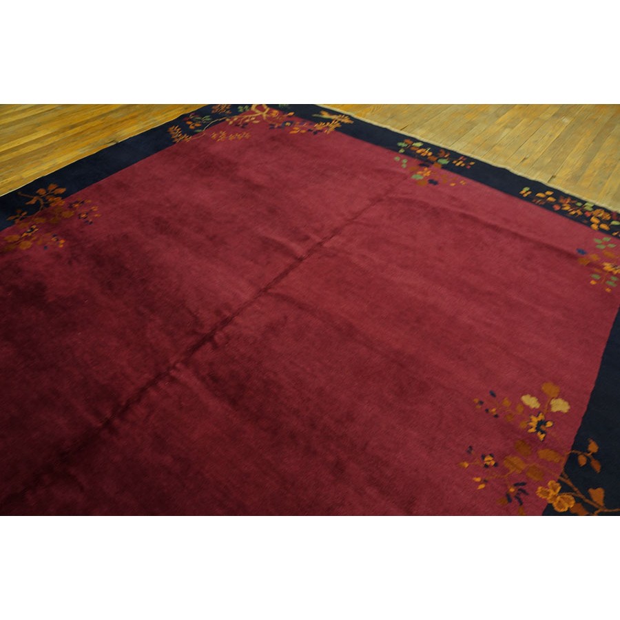 DescriptionChineseCarpets made in China proper. See entries Ningshia, Peking, Art Deco. Chinese - Art DecoAs the name implies, pieces woven between the wars for the Western market by mostly American owned firms especially Nichols and Fette, in thick heavy weaves using strong colors, asymmetric patterns and downplaying the Chinese-ness of the carpet. Nichols rugs are more strong toned than the pastel Fette. Most were woven in the coastal port city of Tientsin. Other lesser known workshops were also active. Some pieces are ultra-geometric and haute-Deco moderne in character: these are very rare. More frequent are pieces with bits of Chinese ornament: vases or other precious objects, paeonies, vines, fences, etc. Most common is the 9 x 12 size, in colors never found in mainstream Chinese rugs: backgrounds in black, mauve, purple, hot pink, orange, olive, employing the best synthetic chrome dyes of the period. Prices are still reasonable and carpets in top condition are available. | |