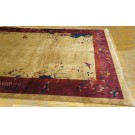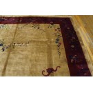 DescriptionChineseCarpets made in China proper. See entries Ningshia, Peking, Art Deco. Chinese - Art DecoAs the name implies, pieces woven between the wars for the Western market by mostly American owned firms especially Nichols and Fette, in thick heavy weaves using strong colors, asymmetric patterns and downplaying the Chinese-ness of the carpet. Nichols rugs are more strong toned than the pastel Fette. Most were woven in the coastal port city of Tientsin. Other lesser known workshops were also active. Some pieces are ultra-geometric and haute-Deco moderne in character: these are very rare. More frequent are pieces with bits of Chinese ornament: vases or other precious objects, paeonies, vines, fences, etc. Most common is the 9 x 12 size, in colors never found in mainstream Chinese rugs: backgrounds in black, mauve, purple, hot pink, orange, olive, employing the best synthetic chrome dyes of the period. Prices are still reasonable and carpets in top condition are available. | |