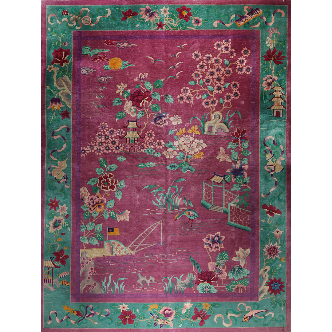 DescriptionChineseCarpets made in China proper. See entries Ningshia, Peking, Art Deco. Chinese - Art DecoAs the name implies, pieces woven between the wars for the Western market by mostly American owned firms especially Nichols and Fette, in thick heavy weaves using strong colors, asymmetric patterns and downplaying the Chinese-ness of the carpet. Nichols rugs are more strong toned than the pastel Fette. Most were woven in the coastal port city of Tientsin. Other lesser known workshops were also active. Some pieces are ultra-geometric and haute-Deco moderne in character: these are very rare. More frequent are pieces with bits of Chinese ornament: vases or other precious objects, paeonies, vines, fences, etc. Most common is the 9 x 12 size, in colors never found in mainstream Chinese rugs: backgrounds in black, mauve, purple, hot pink, orange, olive, employing the best synthetic chrome dyes of the period. Prices are still reasonable and carpets in top condition are available. | |