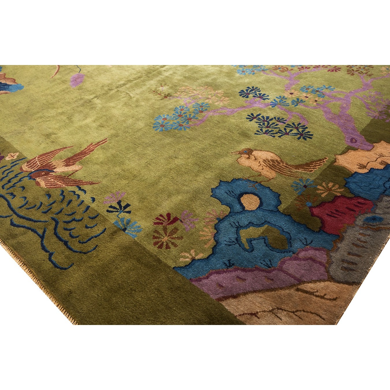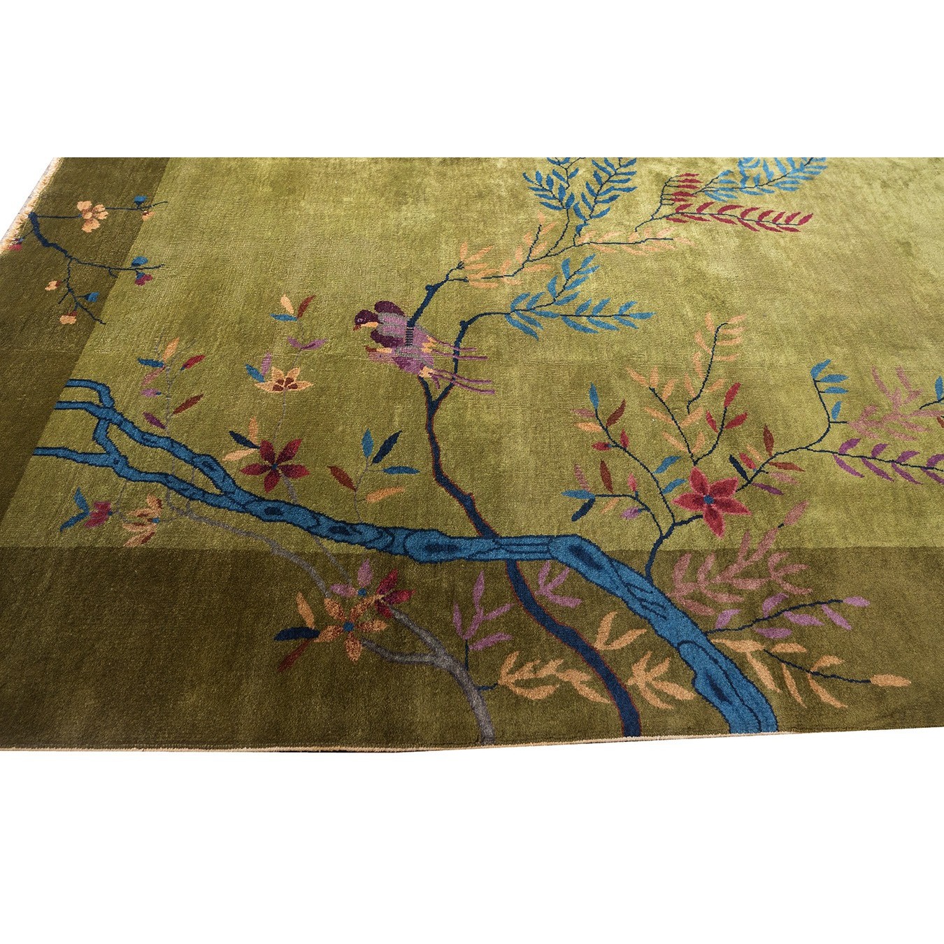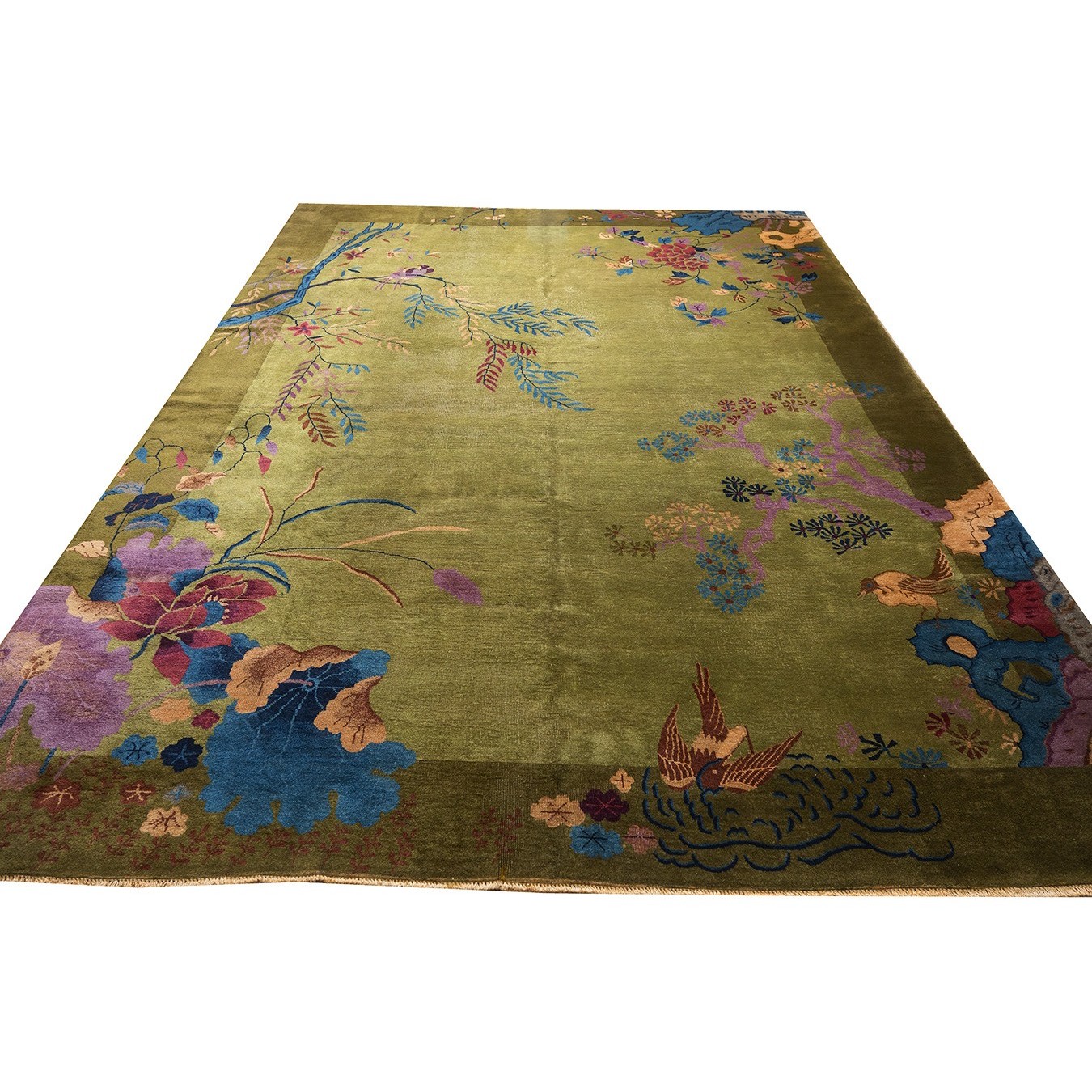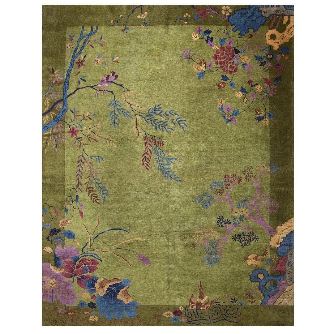 DescriptionChineseCarpets made in China proper. See entries Ningshia, Peking, Art Deco. Chinese - Art DecoAs the name implies, pieces woven between the wars for the Western market by mostly American owned firms especially Nichols and Fette, in thick heavy weaves using strong colors, asymmetric patterns and downplaying the Chinese-ness of the carpet. Nichols rugs are more strong toned than the pastel Fette. Most were woven in the coastal port city of Tientsin. Other lesser known workshops were also active. Some pieces are ultra-geometric and haute-Deco moderne in character: these are very rare. More frequent are pieces with bits of Chinese ornament: vases or other precious objects, paeonies, vines, fences, etc. Most common is the 9 x 12 size, in colors never found in mainstream Chinese rugs: backgrounds in black, mauve, purple, hot pink, orange, olive, employing the best synthetic chrome dyes of the period. Prices are still reasonable and carpets in top condition are available. | |