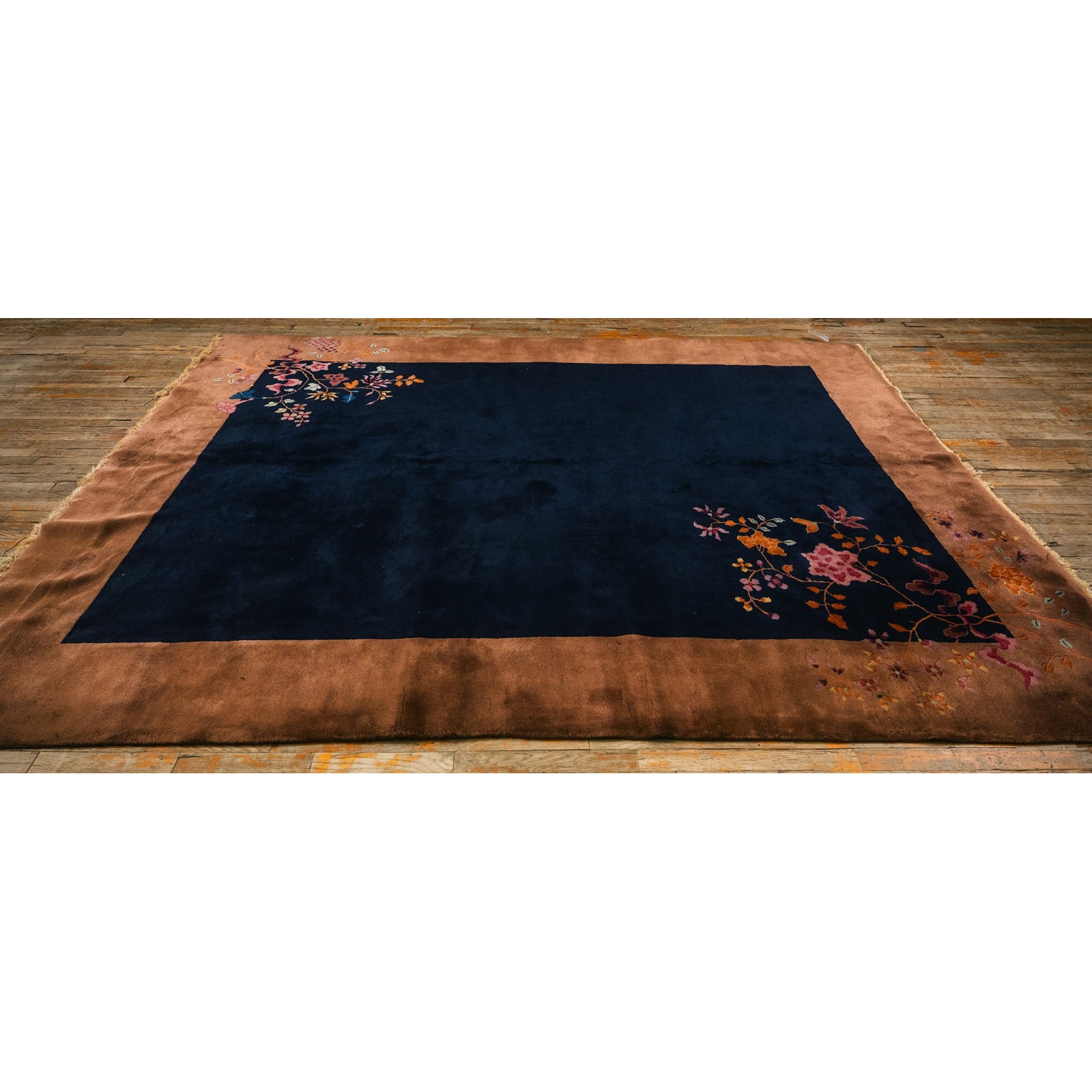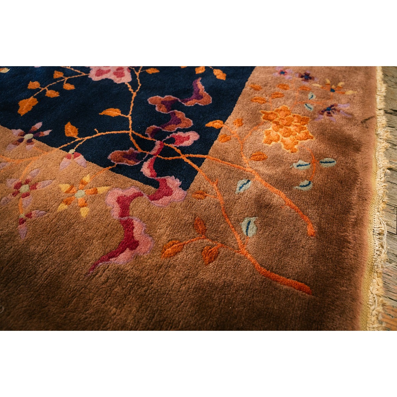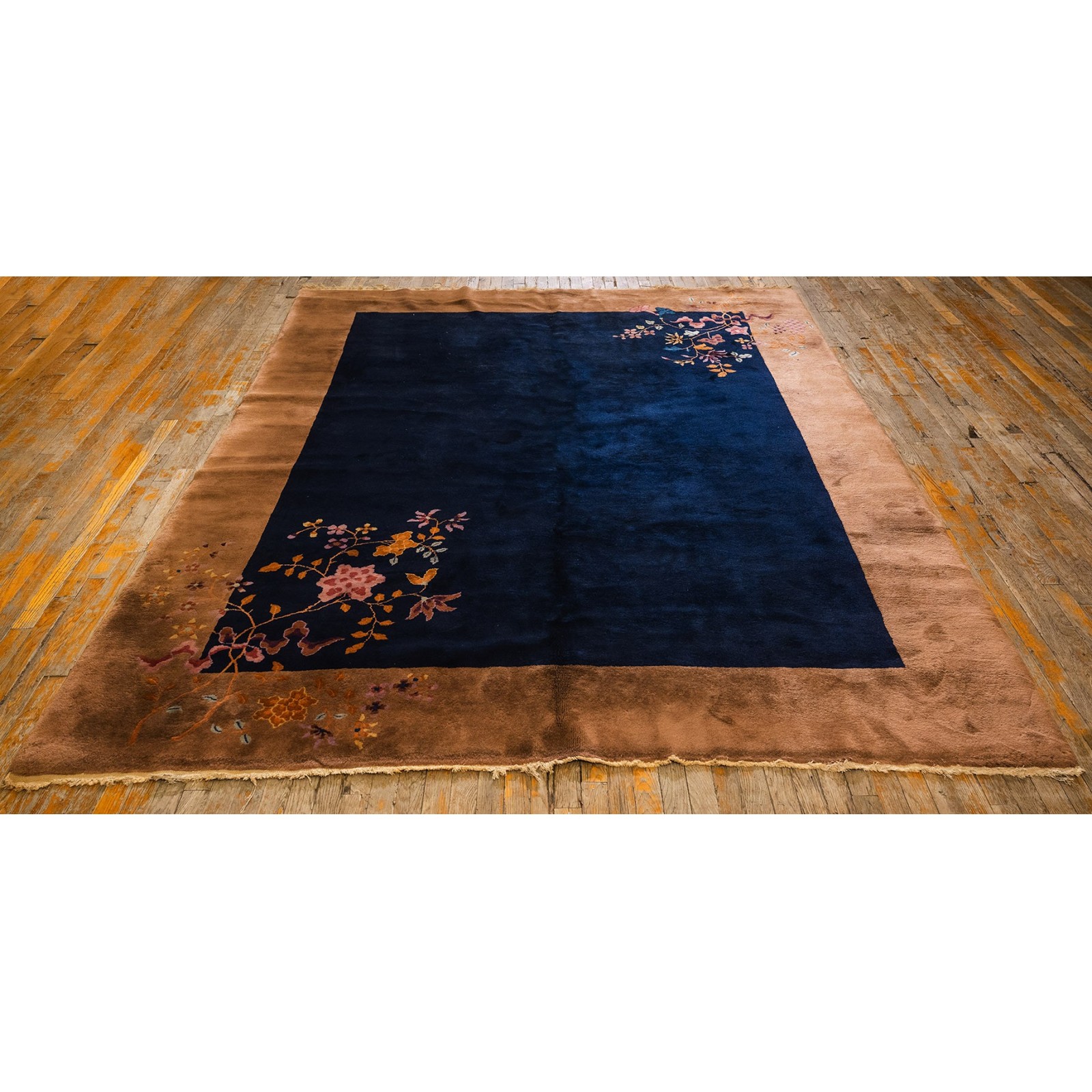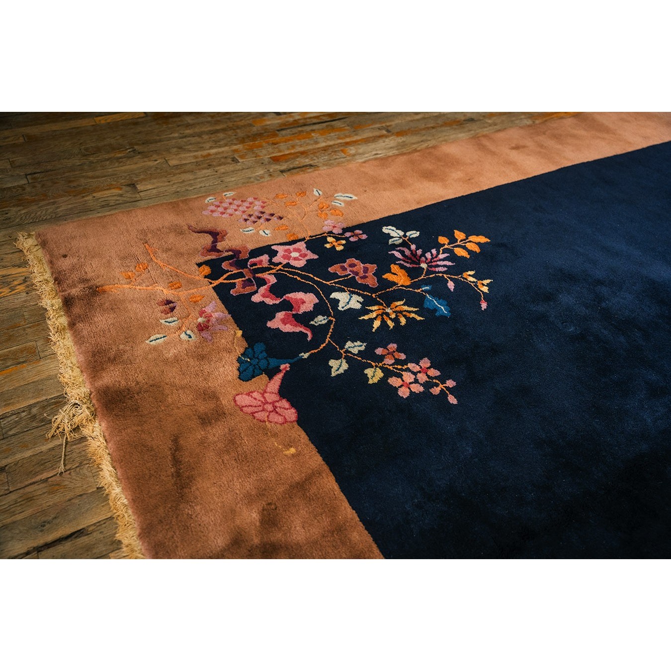 DescriptionChineseCarpets made in China proper. See entries Ningshia, Peking, Art Deco. Chinese - Art DecoAs the name implies, pieces woven between the wars for the Western market by mostly American owned firms especially Nichols and Fette, in thick heavy weaves using strong colors, asymmetric patterns and downplaying the Chinese-ness of the carpet. Nichols rugs are more strong toned than the pastel Fette. Most were woven in the coastal port city of Tientsin. Other lesser known workshops were also active. Some pieces are ultra-geometric and haute-Deco moderne in character: these are very rare. More frequent are pieces with bits of Chinese ornament: vases or other precious objects, paeonies, vines, fences, etc. Most common is the 9 x 12 size, in colors never found in mainstream Chinese rugs: backgrounds in black, mauve, purple, hot pink, orange, olive, employing the best synthetic chrome dyes of the period. Prices are still reasonable and carpets in top condition are available. | |