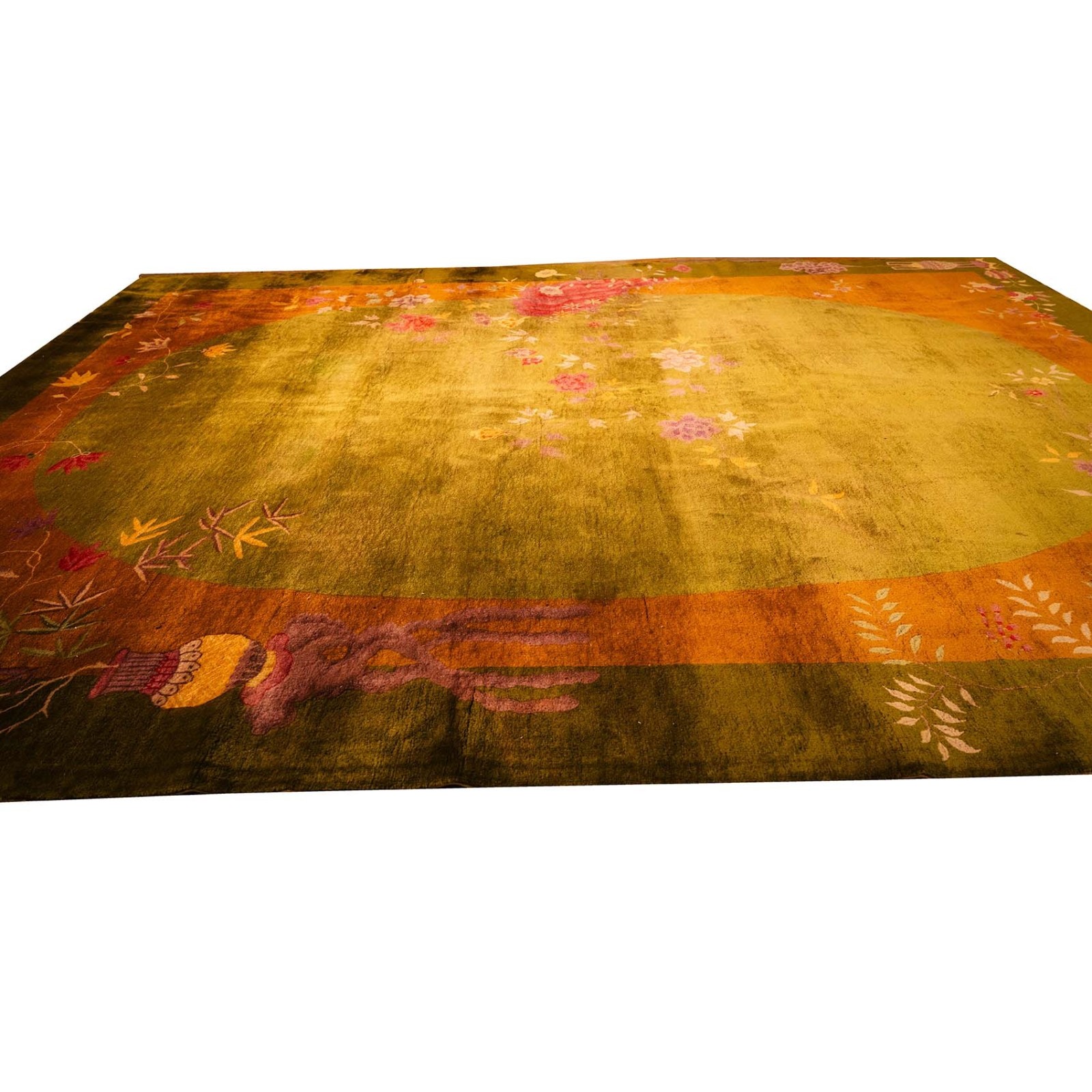DescriptionChineseCarpets made in China proper. See entries Ningshia, Peking, Art Deco. Chinese - Art DecoAs the name implies, pieces woven between the wars for the Western market by mostly American owned firms especially Nichols and Fette, in thick heavy weaves using strong colors, asymmetric patterns and downplaying the Chinese-ness of the carpet. Nichols rugs are more strong toned than the pastel Fette. Most were woven in the coastal port city of Tientsin. Other lesser known workshops were also active. Some pieces are ultra-geometric and haute-Deco moderne in character: these are very rare. More frequent are pieces with bits of Chinese ornament: vases or other precious objects, paeonies, vines, fences, etc. Most common is the 9 x 12 size, in colors never found in mainstream Chinese rugs: backgrounds in black, mauve, purple, hot pink, orange, olive, employing the best synthetic chrome dyes of the period. Prices are still reasonable and carpets in top condition are available. | |