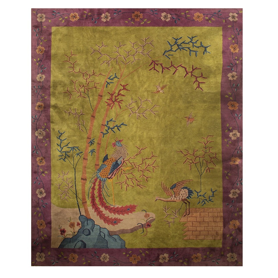 DescriptionChineseCarpets made in China proper. See entries Ningshia, Peking, Art Deco. Chinese - Art DecoAs the name implies, pieces woven between the wars for the Western market by mostly American owned firms especially Nichols and Fette, in thick heavy weaves using strong colors, asymmetric patterns and downplaying the Chinese-ness of the carpet. Nichols rugs are more strong toned than the pastel Fette. Most were woven in the coastal port city of Tientsin. Other lesser known workshops were also active. Some pieces are ultra-geometric and haute-Deco moderne in character: these are very rare. More frequent are pieces with bits of Chinese ornament: vases or other precious objects, paeonies, vines, fences, etc. Most common is the 9 x 12 size, in colors never found in mainstream Chinese rugs: backgrounds in black, mauve, purple, hot pink, orange, olive, employing the best synthetic chrome dyes of the period. Prices are still reasonable and carpets in top condition are available. | |