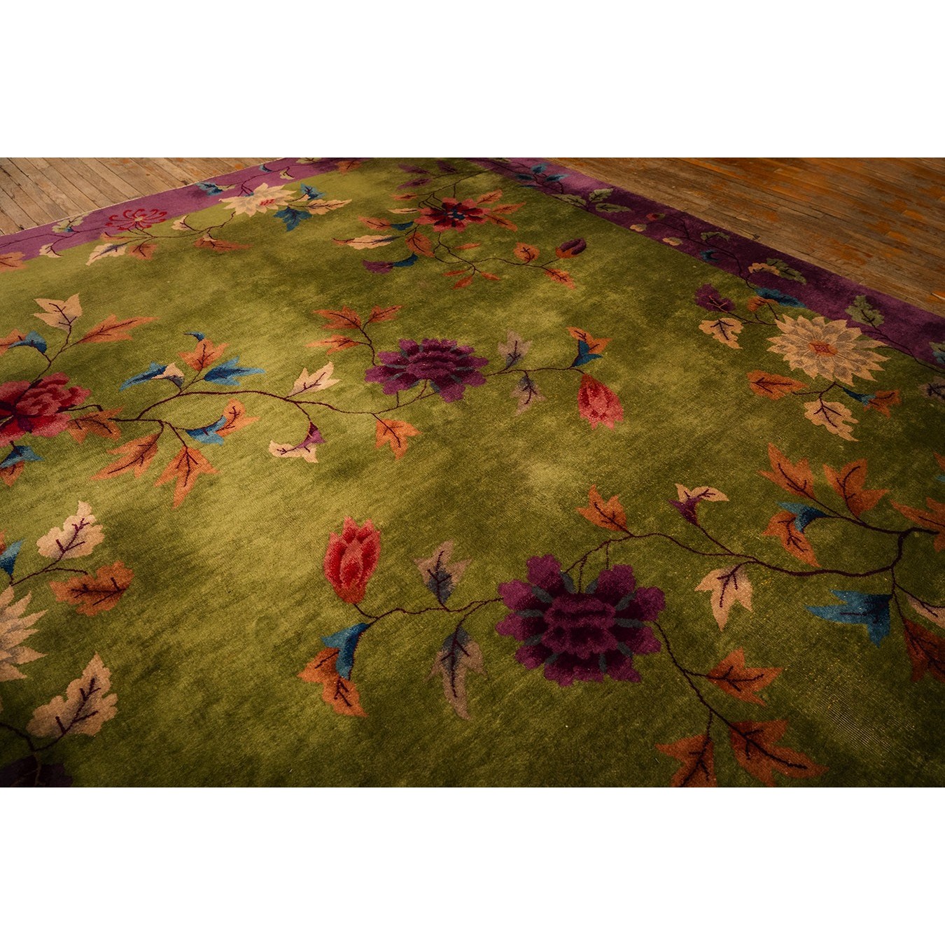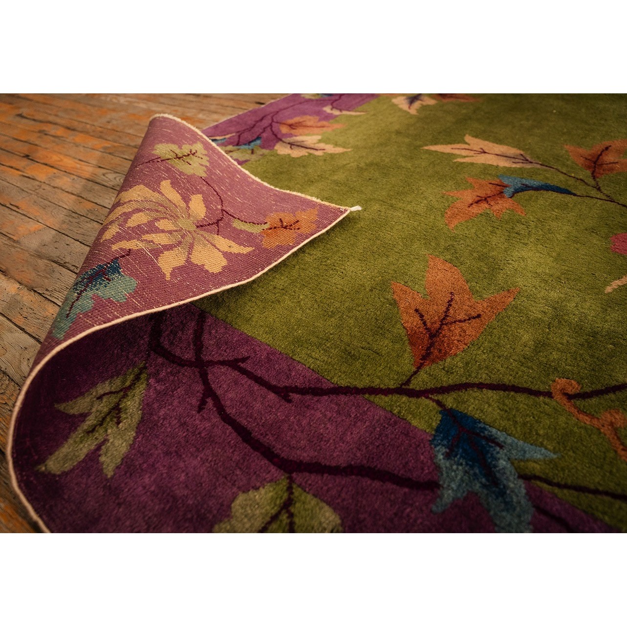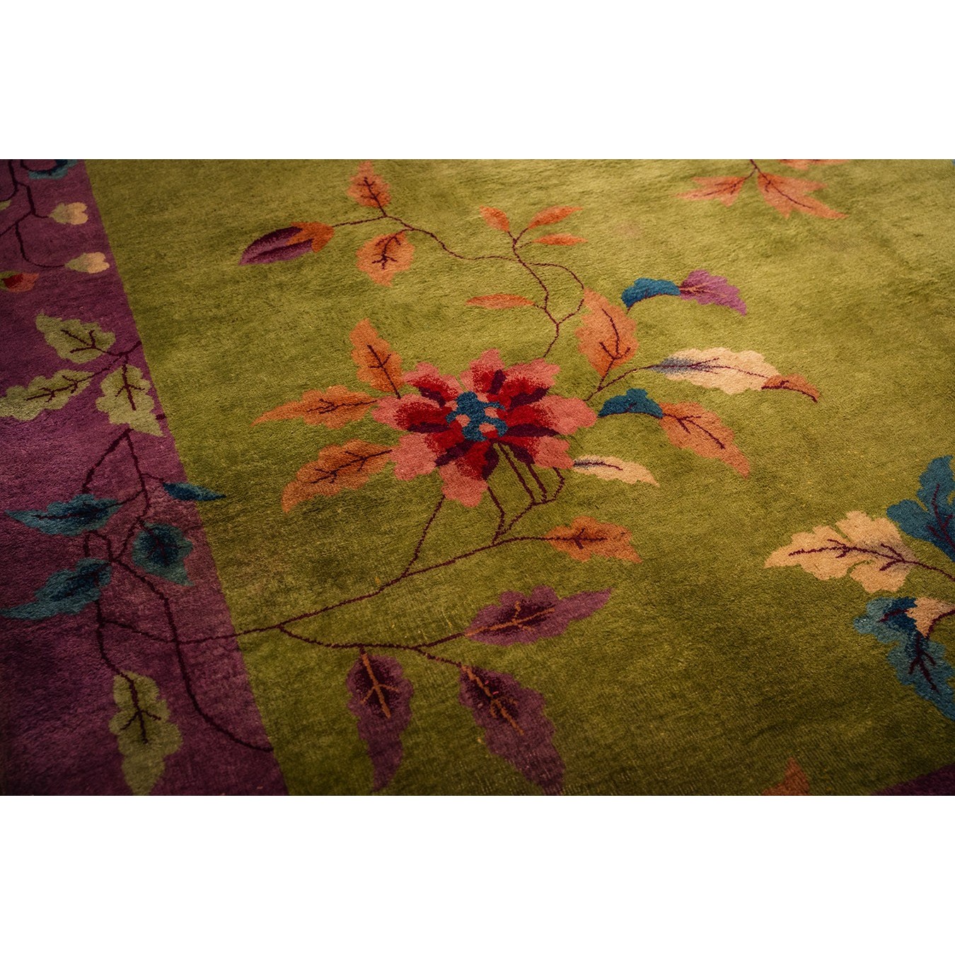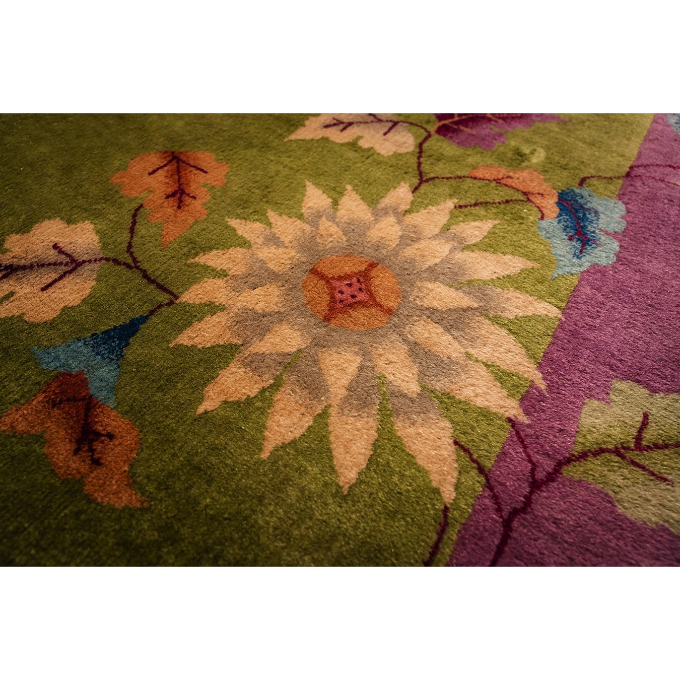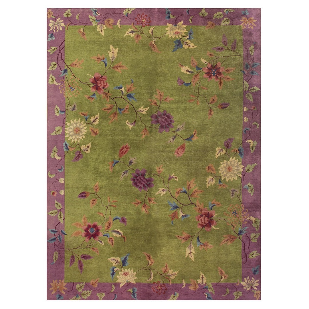 DescriptionChineseCarpets made in China proper. See entries Ningshia, Peking, Art Deco. Chinese - Art DecoAs the name implies, pieces woven between the wars for the Western market by mostly American owned firms especially Nichols and Fette, in thick heavy weaves using strong colors, asymmetric patterns and downplaying the Chinese-ness of the carpet. Nichols rugs are more strong toned than the pastel Fette. Most were woven in the coastal port city of Tientsin. Other lesser known workshops were also active. Some pieces are ultra-geometric and haute-Deco moderne in character: these are very rare. More frequent are pieces with bits of Chinese ornament: vases or other precious objects, paeonies, vines, fences, etc. Most common is the 9 x 12 size, in colors never found in mainstream Chinese rugs: backgrounds in black, mauve, purple, hot pink, orange, olive, employing the best synthetic chrome dyes of the period. Prices are still reasonable and carpets in top condition are available. | |
