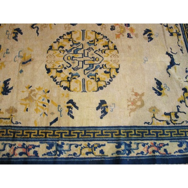 DescriptionChineseCarpets made in China proper. See entries Ningshia, Peking, Art Deco. Chinese - NingxiaThe western Chinese province of Ningshia has a mostly Muslim population and is the source of many of the oldest Chinese carpets of the modern (Ming Dynasty and later) era. The designs are typically Chinese: fretwork or Greek key boarders, pacony palmettes, bats, butterflies, Fu dogs, clouds, dragons, shou symbols, etc. Pollar carpets designed to wrap around monastery columns and displaying a dragon above waves are a specialty. The weave is coarse and soft, with several wefts between knot rows and a longish pile. Yellow golds, dark and light blues are common colors. The outer most plain border on pre 1800 examples is a corrosive brown. Formats include: large square throne carpets, paralleled meditation runners, chair seats and scalloped backs. | |