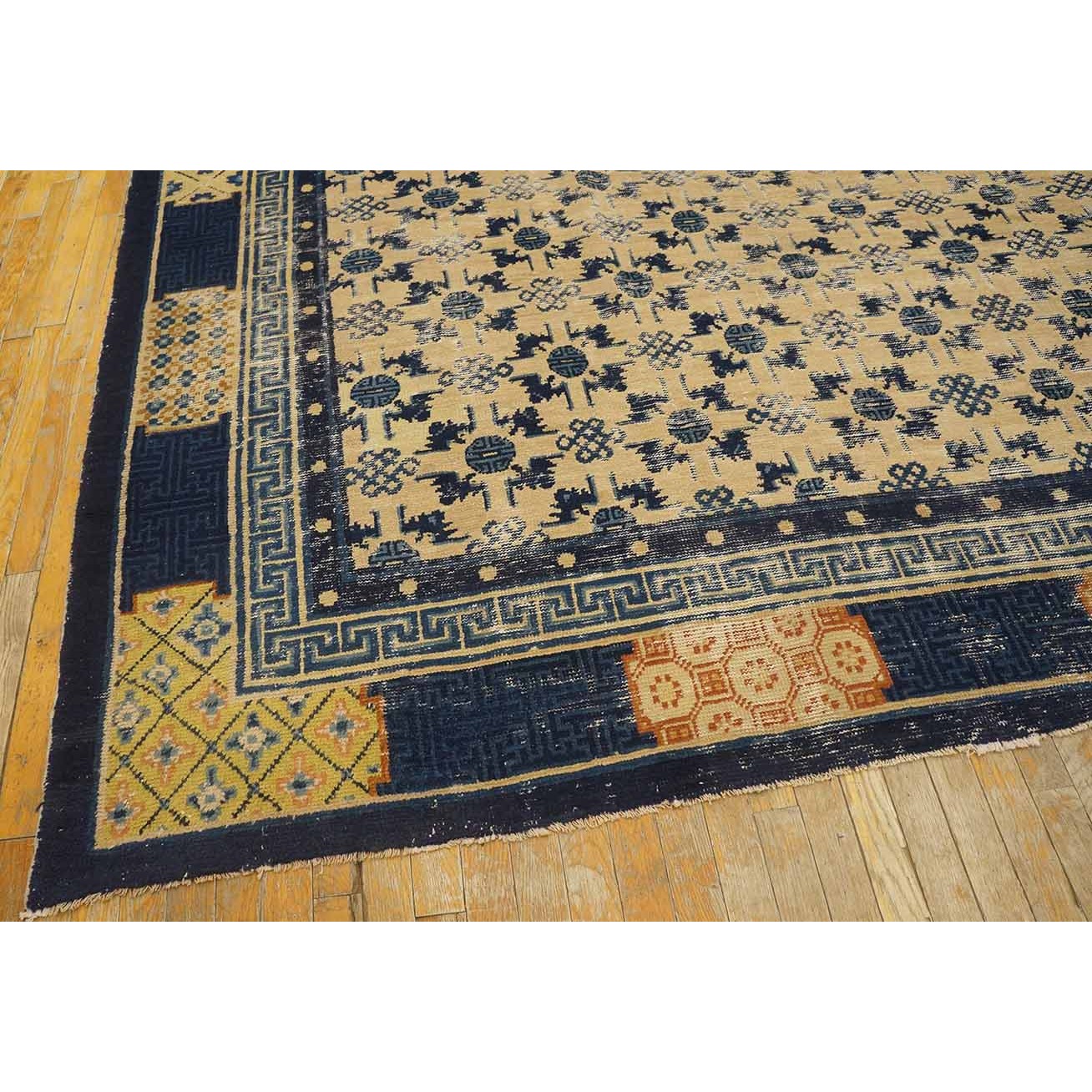 DescriptionChineseCarpets made in China proper. See entries Ningshia, Peking, Art Deco. Chinese - NingxiaThe western Chinese province of Ningshia has a mostly Muslim population and is the source of many of the oldest Chinese carpets of the modern (Ming Dynasty and later) era. The designs are typically Chinese: fretwork or Greek key boarders, pacony palmettes, bats, butterflies, Fu dogs, clouds, dragons, shou symbols, etc. Pollar carpets designed to wrap around monastery columns and displaying a dragon above waves are a specialty. The weave is coarse and soft, with several wefts between knot rows and a longish pile. Yellow golds, dark and light blues are common colors. The outer most plain border on pre 1800 examples is a corrosive brown. Formats include: large square throne carpets, paralleled meditation runners, chair seats and scalloped backs. | |