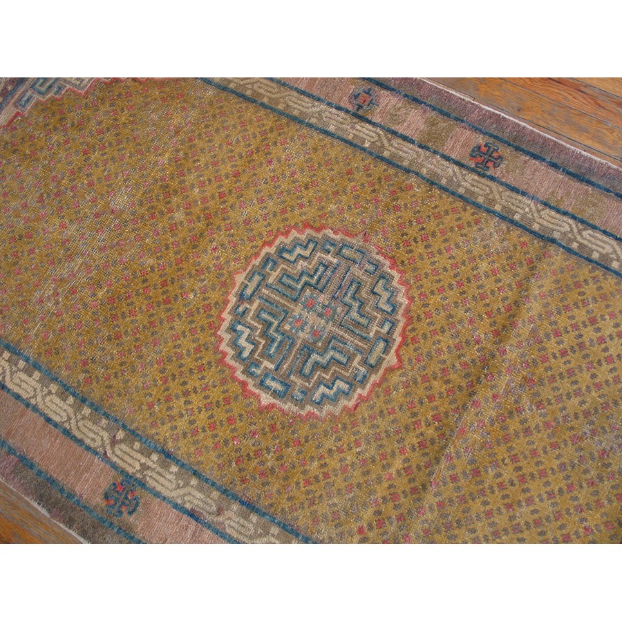 DescriptionChineseCarpets made in China proper. See entries Ningshia, Peking, Art Deco. Chinese - NingxiaThe western Chinese province of Ningshia has a mostly Muslim population and is the source of many of the oldest Chinese carpets of the modern (Ming Dynasty and later) era. The designs are typically Chinese: fretwork or Greek key boarders, pacony palmettes, bats, butterflies, Fu dogs, clouds, dragons, shou symbols, etc. Pollar carpets designed to wrap around monastery columns and displaying a dragon above waves are a specialty. The weave is coarse and soft, with several wefts between knot rows and a longish pile. Yellow golds, dark and light blues are common colors. The outer most plain border on pre 1800 examples is a corrosive brown. Formats include: large square throne carpets, paralleled meditation runners, chair seats and scalloped backs. | |