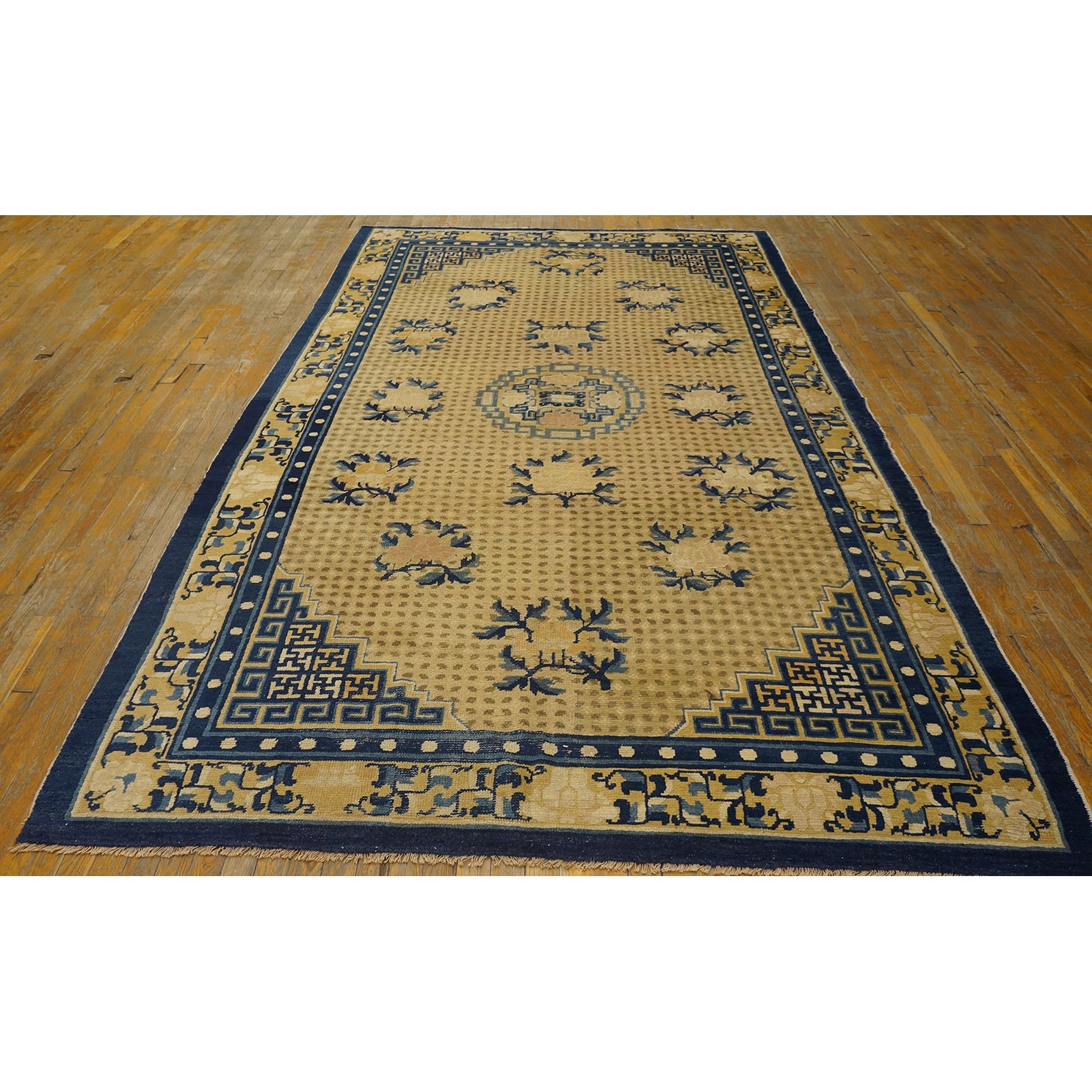DescriptionChineseCarpets made in China proper. See entries Ningshia, Peking, Art Deco. Chinese - NingxiaThe western Chinese province of Ningshia has a mostly Muslim population and is the source of many of the oldest Chinese carpets of the modern (Ming Dynasty and later) era. The designs are typically Chinese: fretwork or Greek key boarders, pacony palmettes, bats, butterflies, Fu dogs, clouds, dragons, shou symbols, etc. Pollar carpets designed to wrap around monastery columns and displaying a dragon above waves are a specialty. The weave is coarse and soft, with several wefts between knot rows and a longish pile. Yellow golds, dark and light blues are common colors. The outer most plain border on pre 1800 examples is a corrosive brown. Formats include: large square throne carpets, paralleled meditation runners, chair seats and scalloped backs. | |