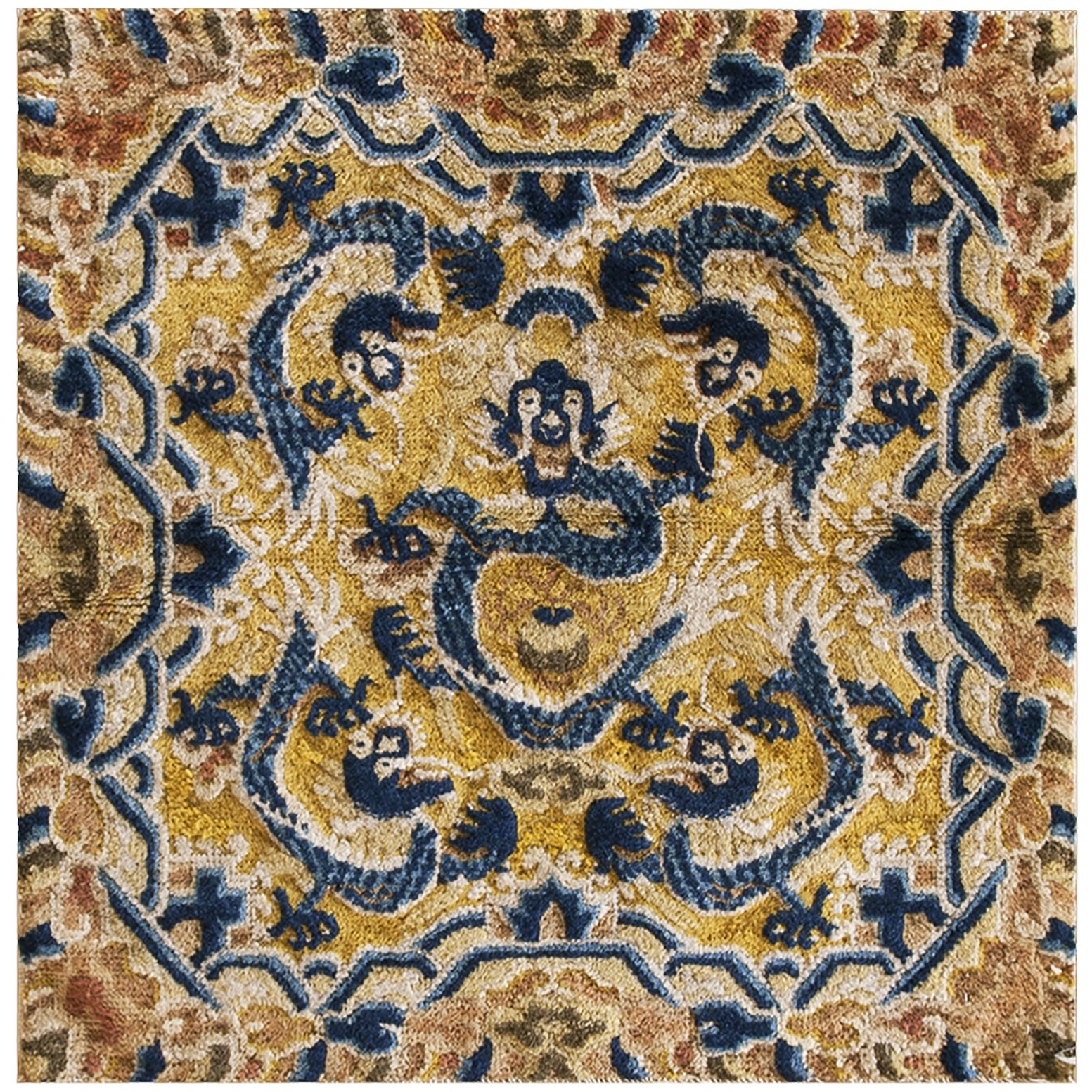 DescriptionChineseCarpets made in China proper. See entries Ningshia, Peking, Art Deco. Chinese - NingxiaThe western Chinese province of Ningshia has a mostly Muslim population and is the source of many of the oldest Chinese carpets of the modern (Ming Dynasty and later) era. The designs are typically Chinese: fretwork or Greek key boarders, pacony palmettes, bats, butterflies, Fu dogs, clouds, dragons, shou symbols, etc. Pollar carpets designed to wrap around monastery columns and displaying a dragon above waves are a specialty. The weave is coarse and soft, with several wefts between knot rows and a longish pile. Yellow golds, dark and light blues are common colors. The outer most plain border on pre 1800 examples is a corrosive brown. Formats include: large square throne carpets, paralleled meditation runners, chair seats and scalloped backs. | |