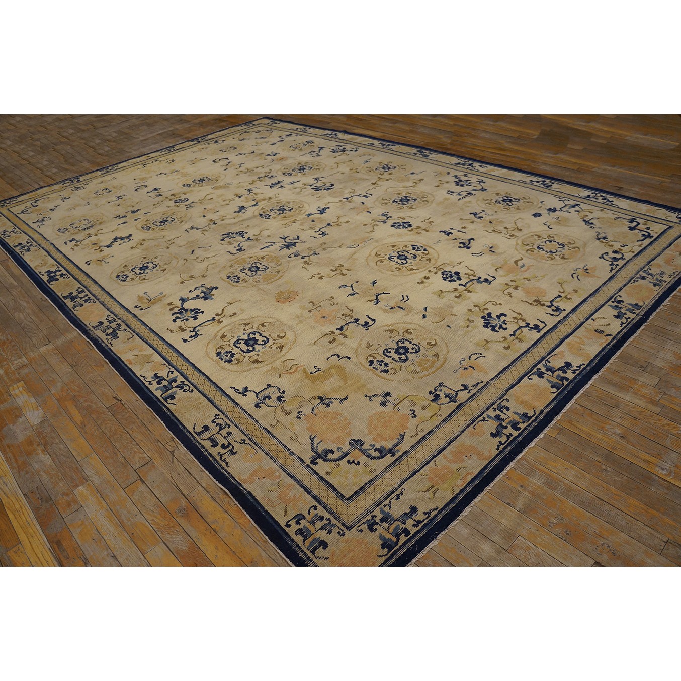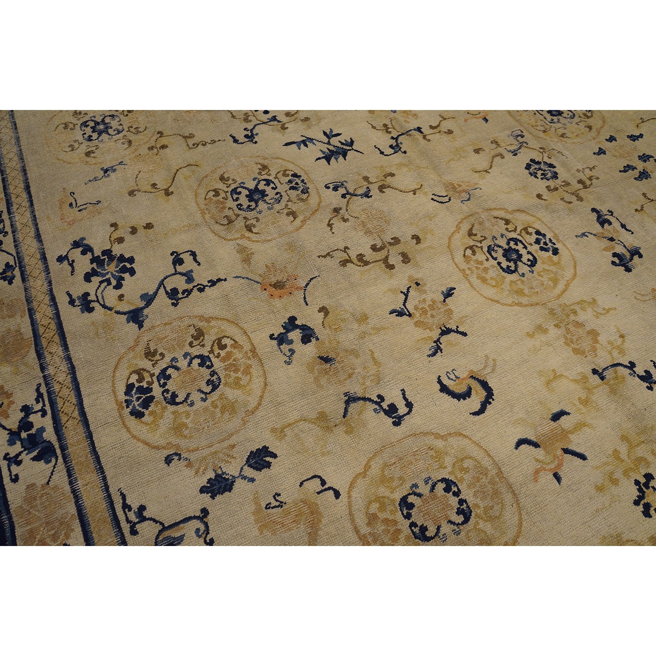DescriptionChineseCarpets made in China proper. See entries Ningshia, Peking, Art Deco. Chinese - NingxiaThe western Chinese province of Ningshia has a mostly Muslim population and is the source of many of the oldest Chinese carpets of the modern (Ming Dynasty and later) era. The designs are typically Chinese: fretwork or Greek key boarders, pacony palmettes, bats, butterflies, Fu dogs, clouds, dragons, shou symbols, etc. Pollar carpets designed to wrap around monastery columns and displaying a dragon above waves are a specialty. The weave is coarse and soft, with several wefts between knot rows and a longish pile. Yellow golds, dark and light blues are common colors. The outer most plain border on pre 1800 examples is a corrosive brown. Formats include: large square throne carpets, paralleled meditation runners, chair seats and scalloped backs. | |