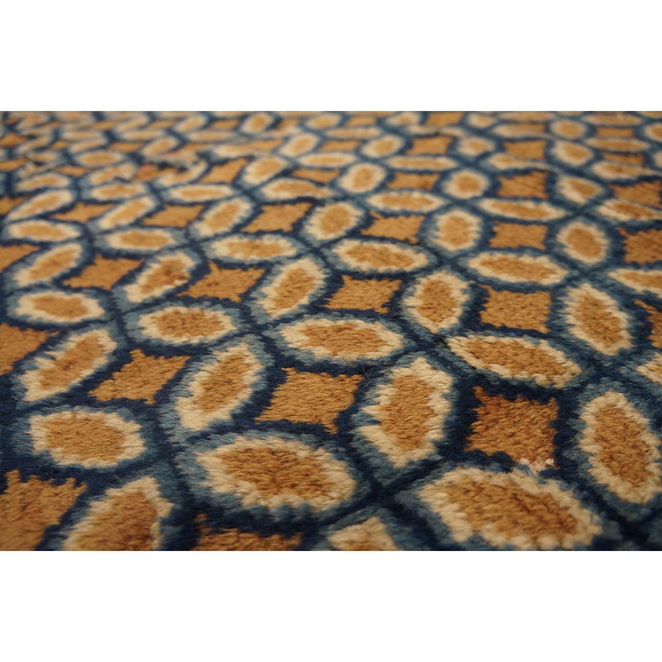 DescriptionChineseCarpets made in China proper. See entries Ningshia, Peking, Art Deco. Chinese - NingxiaThe western Chinese province of Ningshia has a mostly Muslim population and is the source of many of the oldest Chinese carpets of the modern (Ming Dynasty and later) era. The designs are typically Chinese: fretwork or Greek key boarders, pacony palmettes, bats, butterflies, Fu dogs, clouds, dragons, shou symbols, etc. Pollar carpets designed to wrap around monastery columns and displaying a dragon above waves are a specialty. The weave is coarse and soft, with several wefts between knot rows and a longish pile. Yellow golds, dark and light blues are common colors. The outer most plain border on pre 1800 examples is a corrosive brown. Formats include: large square throne carpets, paralleled meditation runners, chair seats and scalloped backs. | |