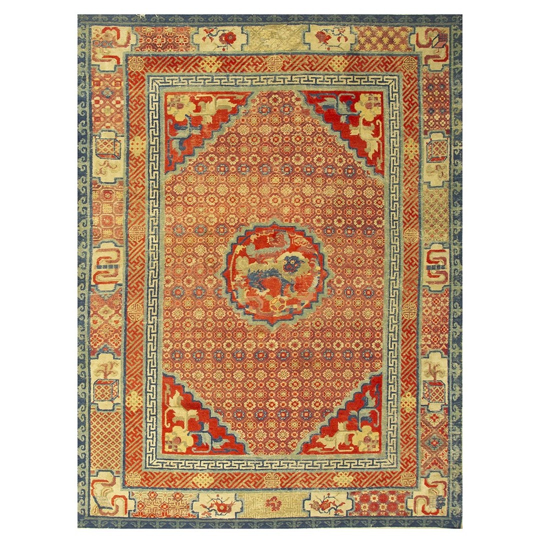 DescriptionChineseCarpets made in China proper. See entries Ningshia, Peking, Art Deco. Chinese - NingxiaThe western Chinese province of Ningshia has a mostly Muslim population and is the source of many of the oldest Chinese carpets of the modern (Ming Dynasty and later) era. The designs are typically Chinese: fretwork or Greek key boarders, pacony palmettes, bats, butterflies, Fu dogs, clouds, dragons, shou symbols, etc. Pollar carpets designed to wrap around monastery columns and displaying a dragon above waves are a specialty. The weave is coarse and soft, with several wefts between knot rows and a longish pile. Yellow golds, dark and light blues are common colors. The outer most plain border on pre 1800 examples is a corrosive brown. Formats include: large square throne carpets, paralleled meditation runners, chair seats and scalloped backs. | |