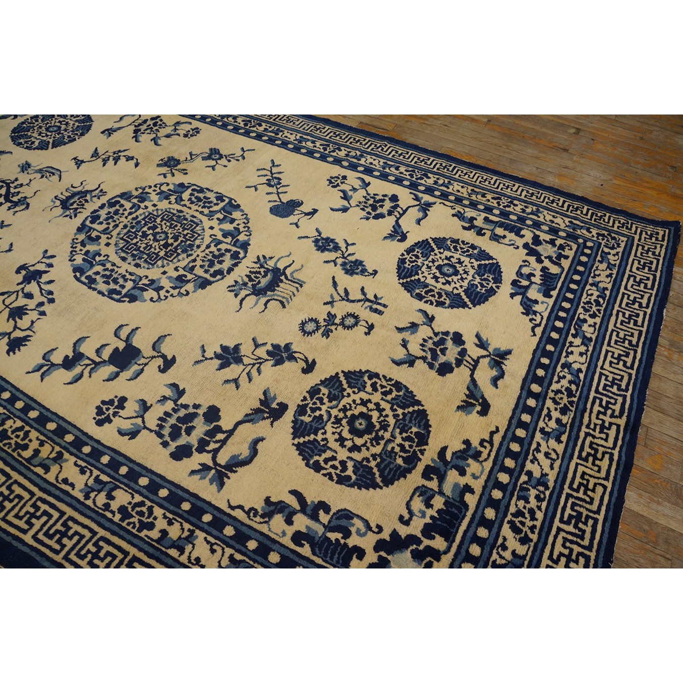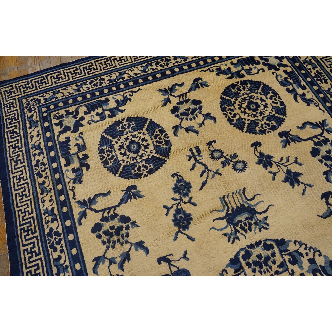 DescriptionChineseCarpets made in China proper. See entries Ningshia, Peking, Art Deco. Chinese - NingxiaThe western Chinese province of Ningshia has a mostly Muslim population and is the source of many of the oldest Chinese carpets of the modern (Ming Dynasty and later) era. The designs are typically Chinese: fretwork or Greek key boarders, pacony palmettes, bats, butterflies, Fu dogs, clouds, dragons, shou symbols, etc. Pollar carpets designed to wrap around monastery columns and displaying a dragon above waves are a specialty. The weave is coarse and soft, with several wefts between knot rows and a longish pile. Yellow golds, dark and light blues are common colors. The outer most plain border on pre 1800 examples is a corrosive brown. Formats include: large square throne carpets, paralleled meditation runners, chair seats and scalloped backs. | |