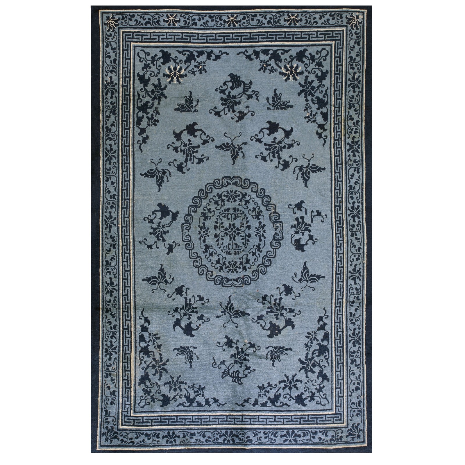 DescriptionChineseCarpets made in China proper. See entries Ningshia, Peking, Art Deco. Chinese - NingxiaThe western Chinese province of Ningshia has a mostly Muslim population and is the source of many of the oldest Chinese carpets of the modern (Ming Dynasty and later) era. The designs are typically Chinese: fretwork or Greek key boarders, pacony palmettes, bats, butterflies, Fu dogs, clouds, dragons, shou symbols, etc. Pollar carpets designed to wrap around monastery columns and displaying a dragon above waves are a specialty. The weave is coarse and soft, with several wefts between knot rows and a longish pile. Yellow golds, dark and light blues are common colors. The outer most plain border on pre 1800 examples is a corrosive brown. Formats include: large square throne carpets, paralleled meditation runners, chair seats and scalloped backs. | |