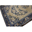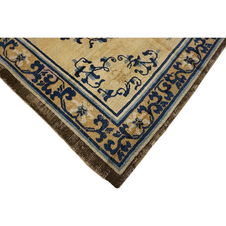 DescriptionChineseCarpets made in China proper. See entries Ningshia, Peking, Art Deco. Chinese - NingxiaThe western Chinese province of Ningshia has a mostly Muslim population and is the source of many of the oldest Chinese carpets of the modern (Ming Dynasty and later) era. The designs are typically Chinese: fretwork or Greek key boarders, pacony palmettes, bats, butterflies, Fu dogs, clouds, dragons, shou symbols, etc. Pollar carpets designed to wrap around monastery columns and displaying a dragon above waves are a specialty. The weave is coarse and soft, with several wefts between knot rows and a longish pile. Yellow golds, dark and light blues are common colors. The outer most plain border on pre 1800 examples is a corrosive brown. Formats include: large square throne carpets, paralleled meditation runners, chair seats and scalloped backs. | |