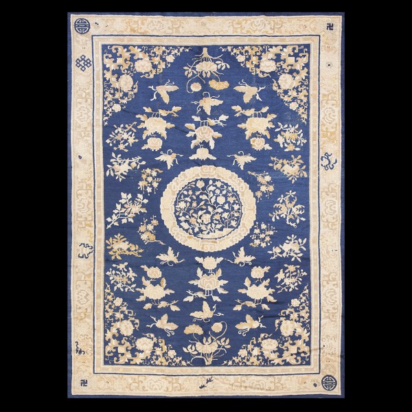 DescriptionChineseCarpets made in China proper. See entries Ningshia, Peking, Art Deco. Chinese - NingxiaThe western Chinese province of Ningshia has a mostly Muslim population and is the source of many of the oldest Chinese carpets of the modern (Ming Dynasty and later) era. The designs are typically Chinese: fretwork or Greek key boarders, pacony palmettes, bats, butterflies, Fu dogs, clouds, dragons, shou symbols, etc. Pollar carpets designed to wrap around monastery columns and displaying a dragon above waves are a specialty. The weave is coarse and soft, with several wefts between knot rows and a longish pile. Yellow golds, dark and light blues are common colors. The outer most plain border on pre 1800 examples is a corrosive brown. Formats include: large square throne carpets, paralleled meditation runners, chair seats and scalloped backs. | |