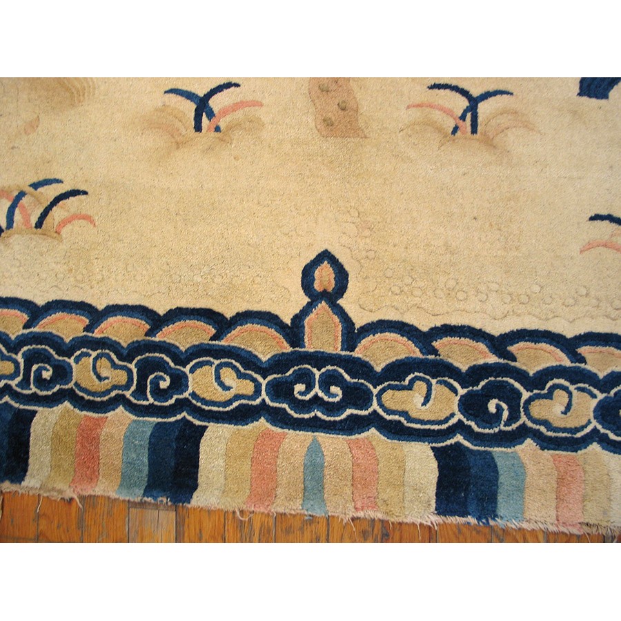 DescriptionChineseCarpets made in China proper. See entries Ningshia, Peking, Art Deco. Chinese - PekingThe commercial Peking carpet is a later 19th century development, begun by importing weaves from Ningshia (see entry) to create and export industry aimed at Western markets. The foundation is cotton and the pile is a good quality carpet wool which takes dyes particularly well. The neat medium weave is in Persian (asymmetric) knots. Designs are strictly Chinese and the whole motif repertoire of Chinese art is employed. Blue and white is the most popular color combination and red is particularly rare. Sizes tend to 9 x 12 and larger, and few small pieces appear. For a short time in the early 1920s Persian designs were woven to capitalize on the death of new Iranian goods. The industry decimated by the Communist Revolution relocated to the Pearl River area. There is a good supply of antique carpets at reasonable prices. | |