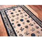 DescriptionChineseCarpets made in China proper. See entries Ningshia, Peking, Art Deco. Chinese - PekingThe commercial Peking carpet is a later 19th century development, begun by importing weaves from Ningshia (see entry) to create and export industry aimed at Western markets. The foundation is cotton and the pile is a good quality carpet wool which takes dyes particularly well. The neat medium weave is in Persian (asymmetric) knots. Designs are strictly Chinese and the whole motif repertoire of Chinese art is employed. Blue and white is the most popular color combination and red is particularly rare. Sizes tend to 9 x 12 and larger, and few small pieces appear. For a short time in the early 1920s Persian designs were woven to capitalize on the death of new Iranian goods. The industry decimated by the Communist Revolution relocated to the Pearl River area. There is a good supply of antique carpets at reasonable prices. | |