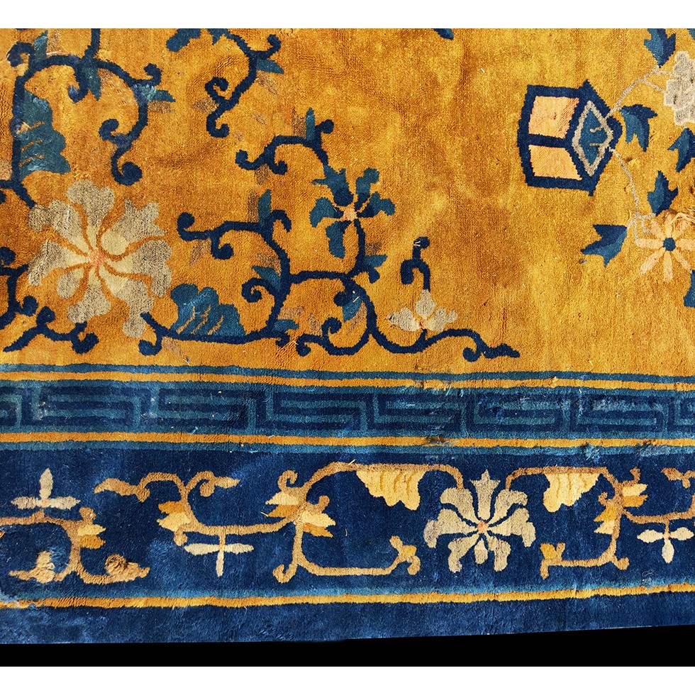 DescriptionChineseCarpets made in China proper. See entries Ningshia, Peking, Art Deco. Chinese - PekingThe commercial Peking carpet is a later 19th century development, begun by importing weaves from Ningshia (see entry) to create and export industry aimed at Western markets. The foundation is cotton and the pile is a good quality carpet wool which takes dyes particularly well. The neat medium weave is in Persian (asymmetric) knots. Designs are strictly Chinese and the whole motif repertoire of Chinese art is employed. Blue and white is the most popular color combination and red is particularly rare. Sizes tend to 9 x 12 and larger, and few small pieces appear. For a short time in the early 1920s Persian designs were woven to capitalize on the death of new Iranian goods. The industry decimated by the Communist Revolution relocated to the Pearl River area. There is a good supply of antique carpets at reasonable prices. | |