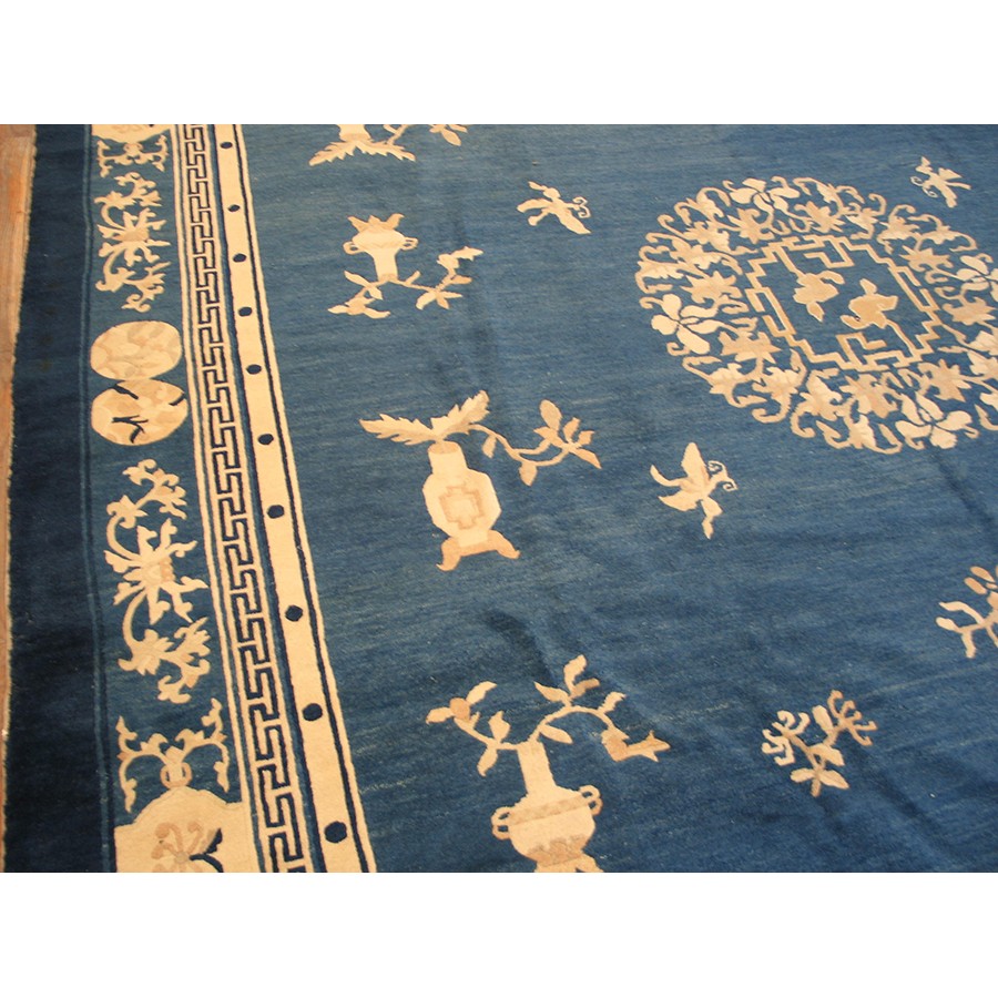DescriptionChineseCarpets made in China proper. See entries Ningshia, Peking, Art Deco. Chinese - PekingThe commercial Peking carpet is a later 19th century development, begun by importing weaves from Ningshia (see entry) to create and export industry aimed at Western markets. The foundation is cotton and the pile is a good quality carpet wool which takes dyes particularly well. The neat medium weave is in Persian (asymmetric) knots. Designs are strictly Chinese and the whole motif repertoire of Chinese art is employed. Blue and white is the most popular color combination and red is particularly rare. Sizes tend to 9 x 12 and larger, and few small pieces appear. For a short time in the early 1920s Persian designs were woven to capitalize on the death of new Iranian goods. The industry decimated by the Communist Revolution relocated to the Pearl River area. There is a good supply of antique carpets at reasonable prices. | |