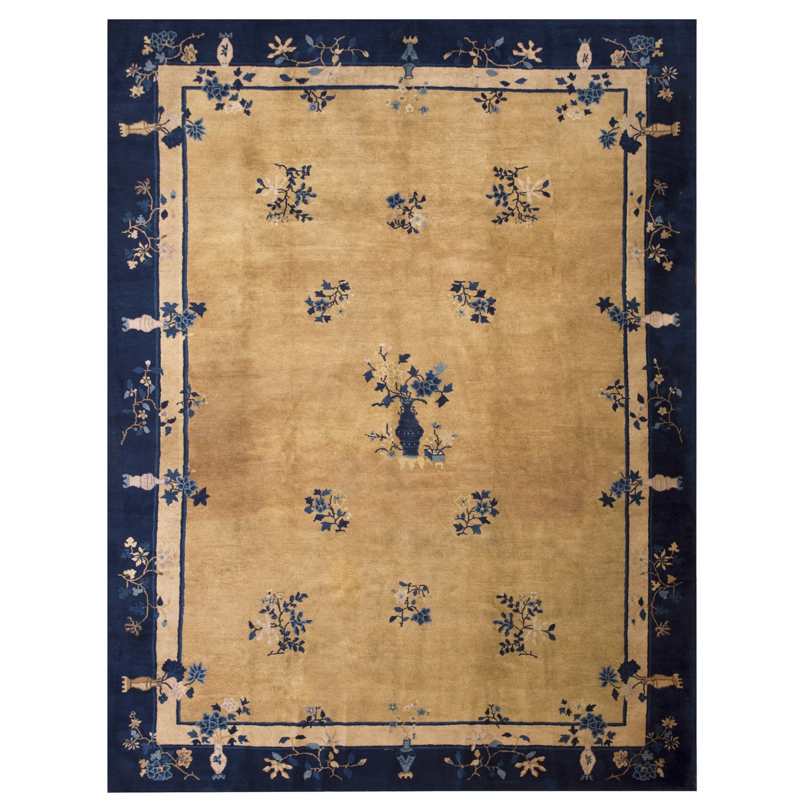 DescriptionChineseCarpets made in China proper. See entries Ningshia, Peking, Art Deco. Chinese - PekingThe commercial Peking carpet is a later 19th century development, begun by importing weaves from Ningshia (see entry) to create and export industry aimed at Western markets. The foundation is cotton and the pile is a good quality carpet wool which takes dyes particularly well. The neat medium weave is in Persian (asymmetric) knots. Designs are strictly Chinese and the whole motif repertoire of Chinese art is employed. Blue and white is the most popular color combination and red is particularly rare. Sizes tend to 9 x 12 and larger, and few small pieces appear. For a short time in the early 1920s Persian designs were woven to capitalize on the death of new Iranian goods. The industry decimated by the Communist Revolution relocated to the Pearl River area. There is a good supply of antique carpets at reasonable prices. | |