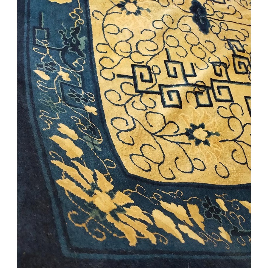DescriptionChineseCarpets made in China proper. See entries Ningshia, Peking, Art Deco. Chinese - PekingThe commercial Peking carpet is a later 19th century development, begun by importing weaves from Ningshia (see entry) to create and export industry aimed at Western markets. The foundation is cotton and the pile is a good quality carpet wool which takes dyes particularly well. The neat medium weave is in Persian (asymmetric) knots. Designs are strictly Chinese and the whole motif repertoire of Chinese art is employed. Blue and white is the most popular color combination and red is particularly rare. Sizes tend to 9 x 12 and larger, and few small pieces appear. For a short time in the early 1920s Persian designs were woven to capitalize on the death of new Iranian goods. The industry decimated by the Communist Revolution relocated to the Pearl River area. There is a good supply of antique carpets at reasonable prices. | |
