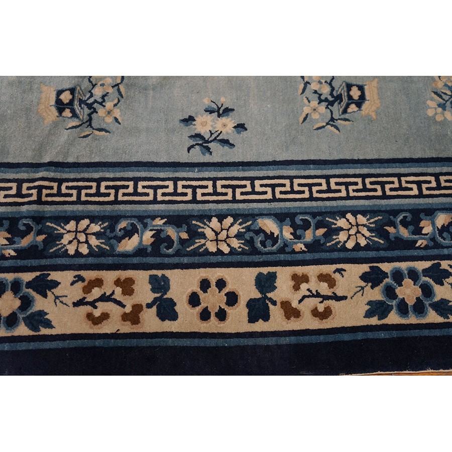 DescriptionChineseCarpets made in China proper. See entries Ningshia, Peking, Art Deco. Chinese - PekingThe commercial Peking carpet is a later 19th century development, begun by importing weaves from Ningshia (see entry) to create and export industry aimed at Western markets. The foundation is cotton and the pile is a good quality carpet wool which takes dyes particularly well. The neat medium weave is in Persian (asymmetric) knots. Designs are strictly Chinese and the whole motif repertoire of Chinese art is employed. Blue and white is the most popular color combination and red is particularly rare. Sizes tend to 9 x 12 and larger, and few small pieces appear. For a short time in the early 1920s Persian designs were woven to capitalize on the death of new Iranian goods. The industry decimated by the Communist Revolution relocated to the Pearl River area. There is a good supply of antique carpets at reasonable prices. | |