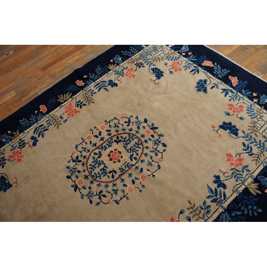 DescriptionChineseCarpets made in China proper. See entries Ningshia, Peking, Art Deco. Chinese - PekingThe commercial Peking carpet is a later 19th century development, begun by importing weaves from Ningshia (see entry) to create and export industry aimed at Western markets. The foundation is cotton and the pile is a good quality carpet wool which takes dyes particularly well. The neat medium weave is in Persian (asymmetric) knots. Designs are strictly Chinese and the whole motif repertoire of Chinese art is employed. Blue and white is the most popular color combination and red is particularly rare. Sizes tend to 9 x 12 and larger, and few small pieces appear. For a short time in the early 1920s Persian designs were woven to capitalize on the death of new Iranian goods. The industry decimated by the Communist Revolution relocated to the Pearl River area. There is a good supply of antique carpets at reasonable prices. | |