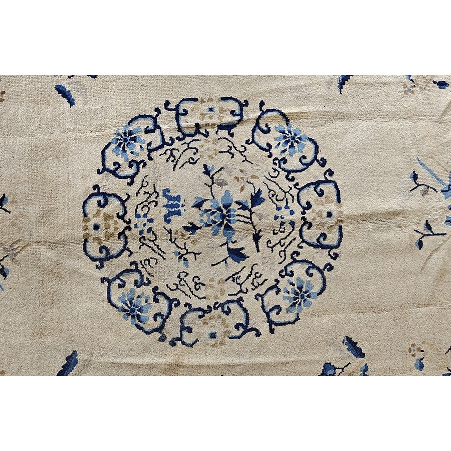 DescriptionChineseCarpets made in China proper. See entries Ningshia, Peking, Art Deco. Chinese - PekingThe commercial Peking carpet is a later 19th century development, begun by importing weaves from Ningshia (see entry) to create and export industry aimed at Western markets. The foundation is cotton and the pile is a good quality carpet wool which takes dyes particularly well. The neat medium weave is in Persian (asymmetric) knots. Designs are strictly Chinese and the whole motif repertoire of Chinese art is employed. Blue and white is the most popular color combination and red is particularly rare. Sizes tend to 9 x 12 and larger, and few small pieces appear. For a short time in the early 1920s Persian designs were woven to capitalize on the death of new Iranian goods. The industry decimated by the Communist Revolution relocated to the Pearl River area. There is a good supply of antique carpets at reasonable prices. | |