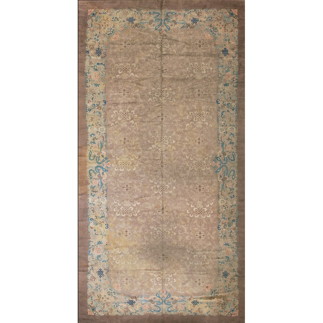 DescriptionChineseCarpets made in China proper. See entries Ningshia, Peking, Art Deco. Chinese - PekingThe commercial Peking carpet is a later 19th century development, begun by importing weaves from Ningshia (see entry) to create and export industry aimed at Western markets. The foundation is cotton and the pile is a good quality carpet wool which takes dyes particularly well. The neat medium weave is in Persian (asymmetric) knots. Designs are strictly Chinese and the whole motif repertoire of Chinese art is employed. Blue and white is the most popular color combination and red is particularly rare. Sizes tend to 9 x 12 and larger, and few small pieces appear. For a short time in the early 1920s Persian designs were woven to capitalize on the death of new Iranian goods. The industry decimated by the Communist Revolution relocated to the Pearl River area. There is a good supply of antique carpets at reasonable prices. | |
