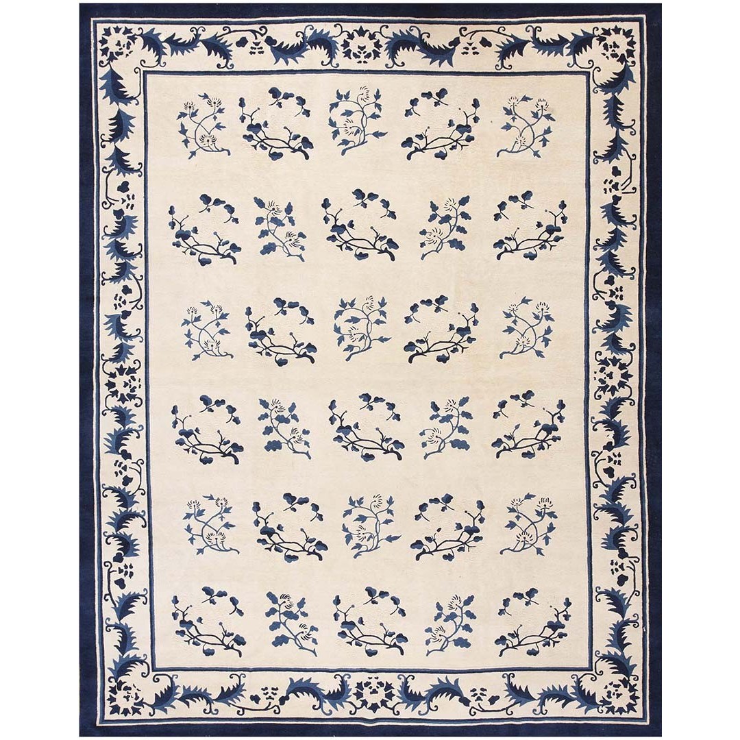 DescriptionChineseCarpets made in China proper. See entries Ningshia, Peking, Art Deco. Chinese - PekingThe commercial Peking carpet is a later 19th century development, begun by importing weaves from Ningshia (see entry) to create and export industry aimed at Western markets. The foundation is cotton and the pile is a good quality carpet wool which takes dyes particularly well. The neat medium weave is in Persian (asymmetric) knots. Designs are strictly Chinese and the whole motif repertoire of Chinese art is employed. Blue and white is the most popular color combination and red is particularly rare. Sizes tend to 9 x 12 and larger, and few small pieces appear. For a short time in the early 1920s Persian designs were woven to capitalize on the death of new Iranian goods. The industry decimated by the Communist Revolution relocated to the Pearl River area. There is a good supply of antique carpets at reasonable prices. | |