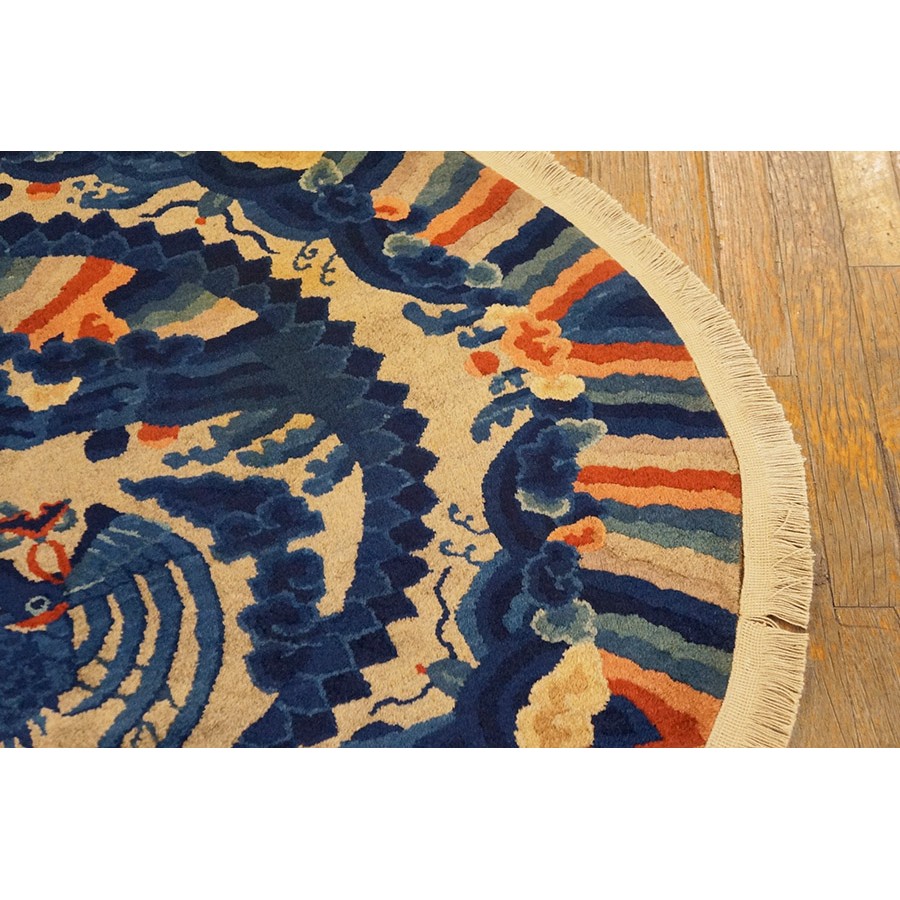 DescriptionChineseCarpets made in China proper. See entries Ningshia, Peking, Art Deco. Chinese - PekingThe commercial Peking carpet is a later 19th century development, begun by importing weaves from Ningshia (see entry) to create and export industry aimed at Western markets. The foundation is cotton and the pile is a good quality carpet wool which takes dyes particularly well. The neat medium weave is in Persian (asymmetric) knots. Designs are strictly Chinese and the whole motif repertoire of Chinese art is employed. Blue and white is the most popular color combination and red is particularly rare. Sizes tend to 9 x 12 and larger, and few small pieces appear. For a short time in the early 1920s Persian designs were woven to capitalize on the death of new Iranian goods. The industry decimated by the Communist Revolution relocated to the Pearl River area. There is a good supply of antique carpets at reasonable prices. | |