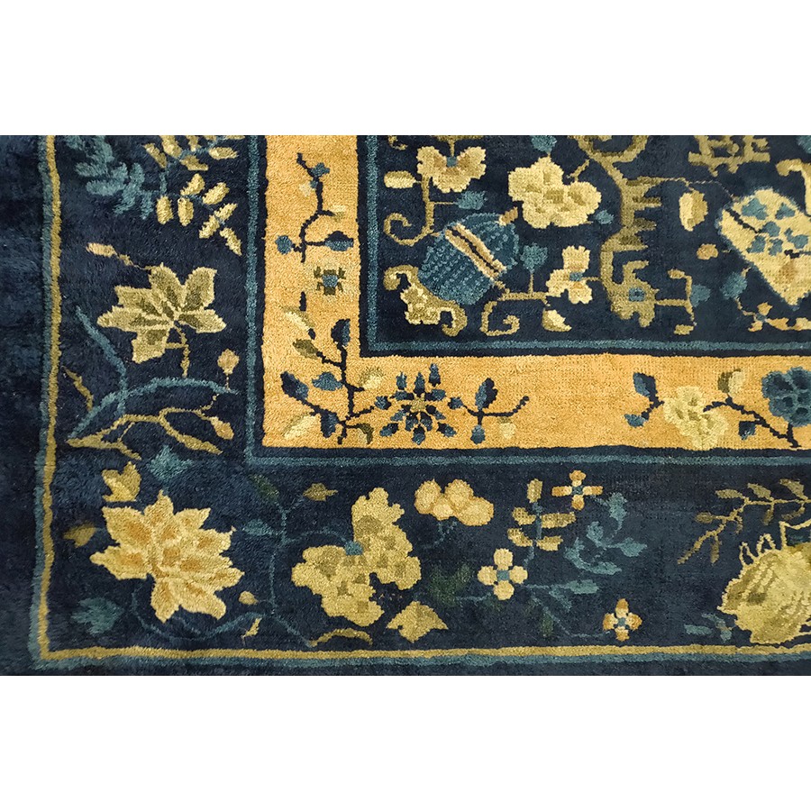DescriptionChineseCarpets made in China proper. See entries Ningshia, Peking, Art Deco. Chinese - PekingThe commercial Peking carpet is a later 19th century development, begun by importing weaves from Ningshia (see entry) to create and export industry aimed at Western markets. The foundation is cotton and the pile is a good quality carpet wool which takes dyes particularly well. The neat medium weave is in Persian (asymmetric) knots. Designs are strictly Chinese and the whole motif repertoire of Chinese art is employed. Blue and white is the most popular color combination and red is particularly rare. Sizes tend to 9 x 12 and larger, and few small pieces appear. For a short time in the early 1920s Persian designs were woven to capitalize on the death of new Iranian goods. The industry decimated by the Communist Revolution relocated to the Pearl River area. There is a good supply of antique carpets at reasonable prices. | |