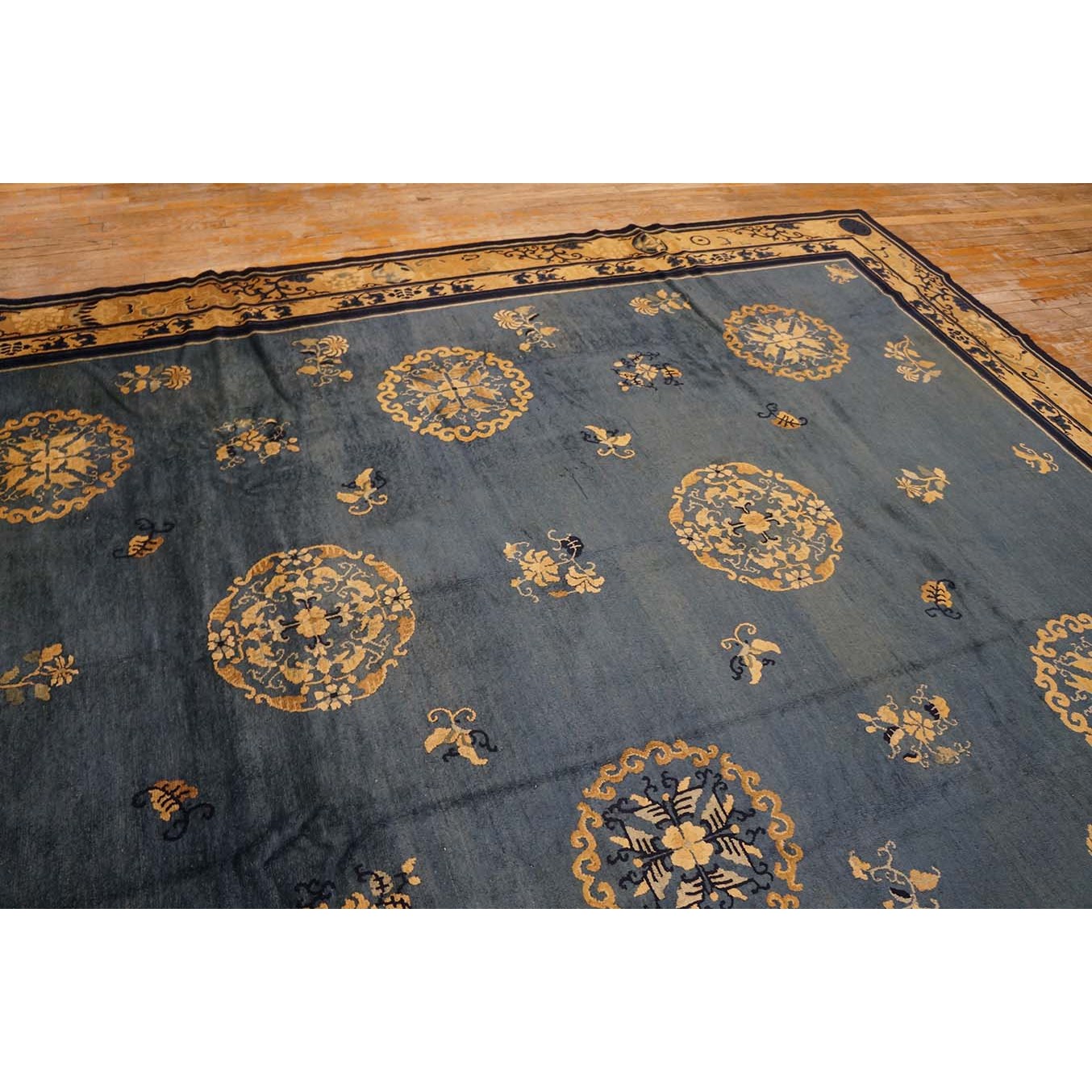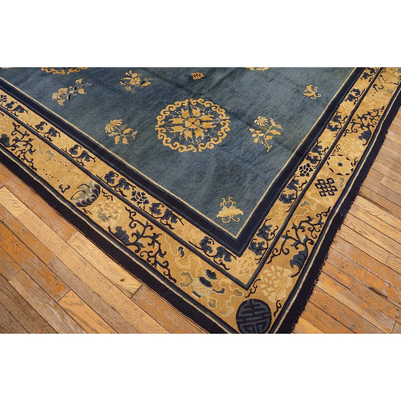 DescriptionChineseCarpets made in China proper. See entries Ningshia, Peking, Art Deco. Chinese - PekingThe commercial Peking carpet is a later 19th century development, begun by importing weaves from Ningshia (see entry) to create and export industry aimed at Western markets. The foundation is cotton and the pile is a good quality carpet wool which takes dyes particularly well. The neat medium weave is in Persian (asymmetric) knots. Designs are strictly Chinese and the whole motif repertoire of Chinese art is employed. Blue and white is the most popular color combination and red is particularly rare. Sizes tend to 9 x 12 and larger, and few small pieces appear. For a short time in the early 1920s Persian designs were woven to capitalize on the death of new Iranian goods. The industry decimated by the Communist Revolution relocated to the Pearl River area. There is a good supply of antique carpets at reasonable prices. | |