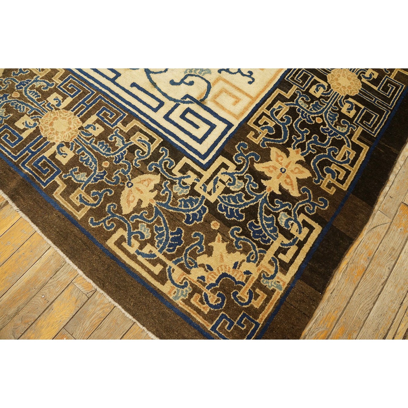 DescriptionChineseCarpets made in China proper. See entries Ningshia, Peking, Art Deco. Chinese - PekingThe commercial Peking carpet is a later 19th century development, begun by importing weaves from Ningshia (see entry) to create and export industry aimed at Western markets. The foundation is cotton and the pile is a good quality carpet wool which takes dyes particularly well. The neat medium weave is in Persian (asymmetric) knots. Designs are strictly Chinese and the whole motif repertoire of Chinese art is employed. Blue and white is the most popular color combination and red is particularly rare. Sizes tend to 9 x 12 and larger, and few small pieces appear. For a short time in the early 1920s Persian designs were woven to capitalize on the death of new Iranian goods. The industry decimated by the Communist Revolution relocated to the Pearl River area. There is a good supply of antique carpets at reasonable prices. | |