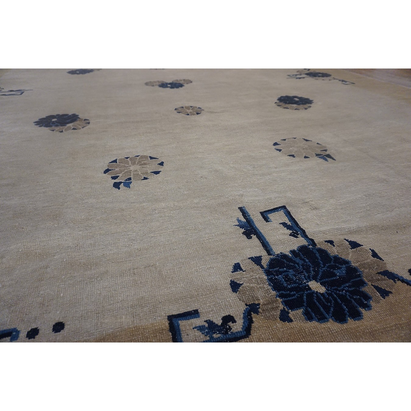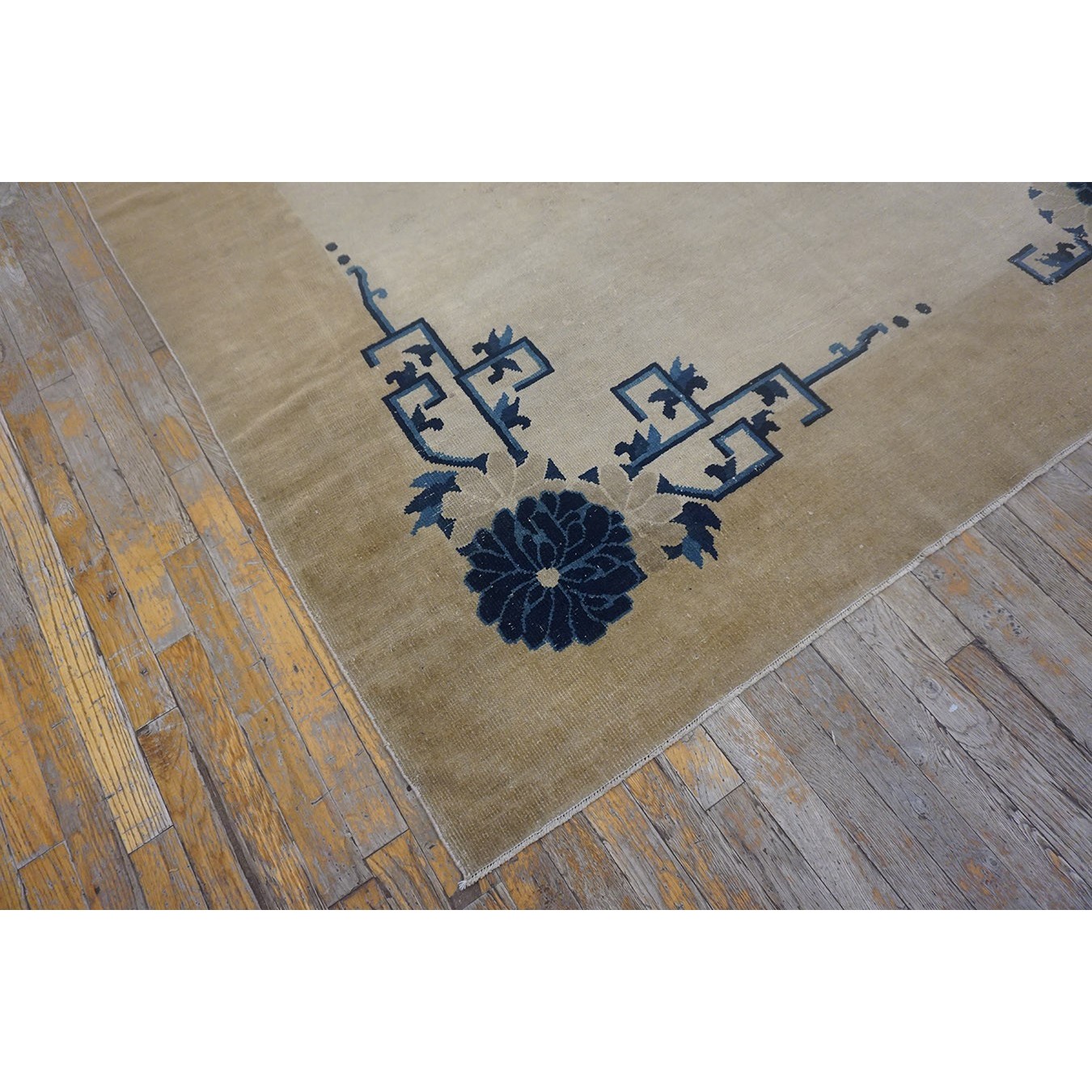 DescriptionChineseCarpets made in China proper. See entries Ningshia, Peking, Art Deco. Chinese - PekingThe commercial Peking carpet is a later 19th century development, begun by importing weaves from Ningshia (see entry) to create and export industry aimed at Western markets. The foundation is cotton and the pile is a good quality carpet wool which takes dyes particularly well. The neat medium weave is in Persian (asymmetric) knots. Designs are strictly Chinese and the whole motif repertoire of Chinese art is employed. Blue and white is the most popular color combination and red is particularly rare. Sizes tend to 9 x 12 and larger, and few small pieces appear. For a short time in the early 1920s Persian designs were woven to capitalize on the death of new Iranian goods. The industry decimated by the Communist Revolution relocated to the Pearl River area. There is a good supply of antique carpets at reasonable prices. | |