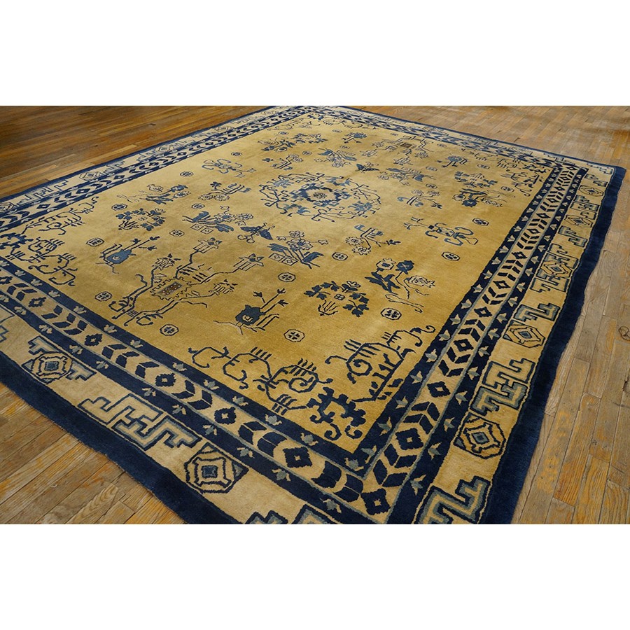 DescriptionChineseCarpets made in China proper. See entries Ningshia, Peking, Art Deco. Chinese - PekingThe commercial Peking carpet is a later 19th century development, begun by importing weaves from Ningshia (see entry) to create and export industry aimed at Western markets. The foundation is cotton and the pile is a good quality carpet wool which takes dyes particularly well. The neat medium weave is in Persian (asymmetric) knots. Designs are strictly Chinese and the whole motif repertoire of Chinese art is employed. Blue and white is the most popular color combination and red is particularly rare. Sizes tend to 9 x 12 and larger, and few small pieces appear. For a short time in the early 1920s Persian designs were woven to capitalize on the death of new Iranian goods. The industry decimated by the Communist Revolution relocated to the Pearl River area. There is a good supply of antique carpets at reasonable prices. | |