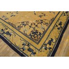 DescriptionChineseCarpets made in China proper. See entries Ningshia, Peking, Art Deco. Chinese - PekingThe commercial Peking carpet is a later 19th century development, begun by importing weaves from Ningshia (see entry) to create and export industry aimed at Western markets. The foundation is cotton and the pile is a good quality carpet wool which takes dyes particularly well. The neat medium weave is in Persian (asymmetric) knots. Designs are strictly Chinese and the whole motif repertoire of Chinese art is employed. Blue and white is the most popular color combination and red is particularly rare. Sizes tend to 9 x 12 and larger, and few small pieces appear. For a short time in the early 1920s Persian designs were woven to capitalize on the death of new Iranian goods. The industry decimated by the Communist Revolution relocated to the Pearl River area. There is a good supply of antique carpets at reasonable prices. | |