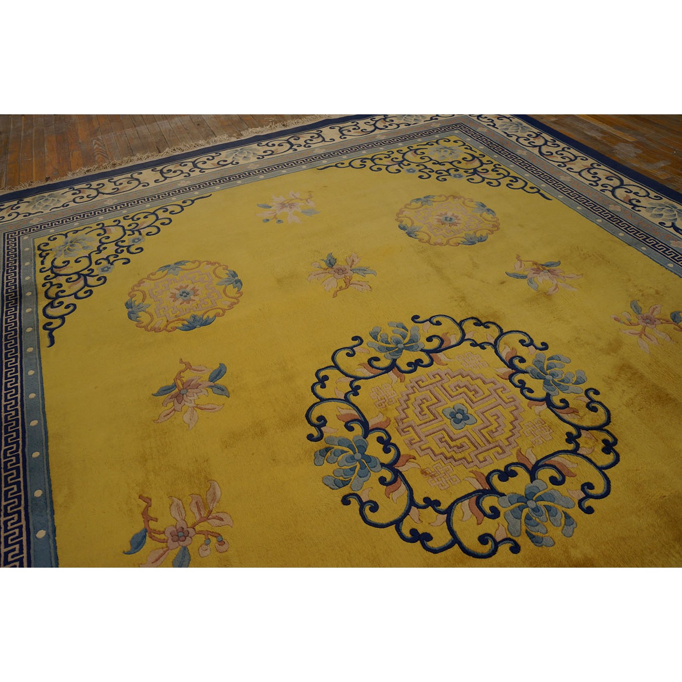 DescriptionChineseCarpets made in China proper. See entries Ningshia, Peking, Art Deco. Chinese - PekingThe commercial Peking carpet is a later 19th century development, begun by importing weaves from Ningshia (see entry) to create and export industry aimed at Western markets. The foundation is cotton and the pile is a good quality carpet wool which takes dyes particularly well. The neat medium weave is in Persian (asymmetric) knots. Designs are strictly Chinese and the whole motif repertoire of Chinese art is employed. Blue and white is the most popular color combination and red is particularly rare. Sizes tend to 9 x 12 and larger, and few small pieces appear. For a short time in the early 1920s Persian designs were woven to capitalize on the death of new Iranian goods. The industry decimated by the Communist Revolution relocated to the Pearl River area. There is a good supply of antique carpets at reasonable prices. | |