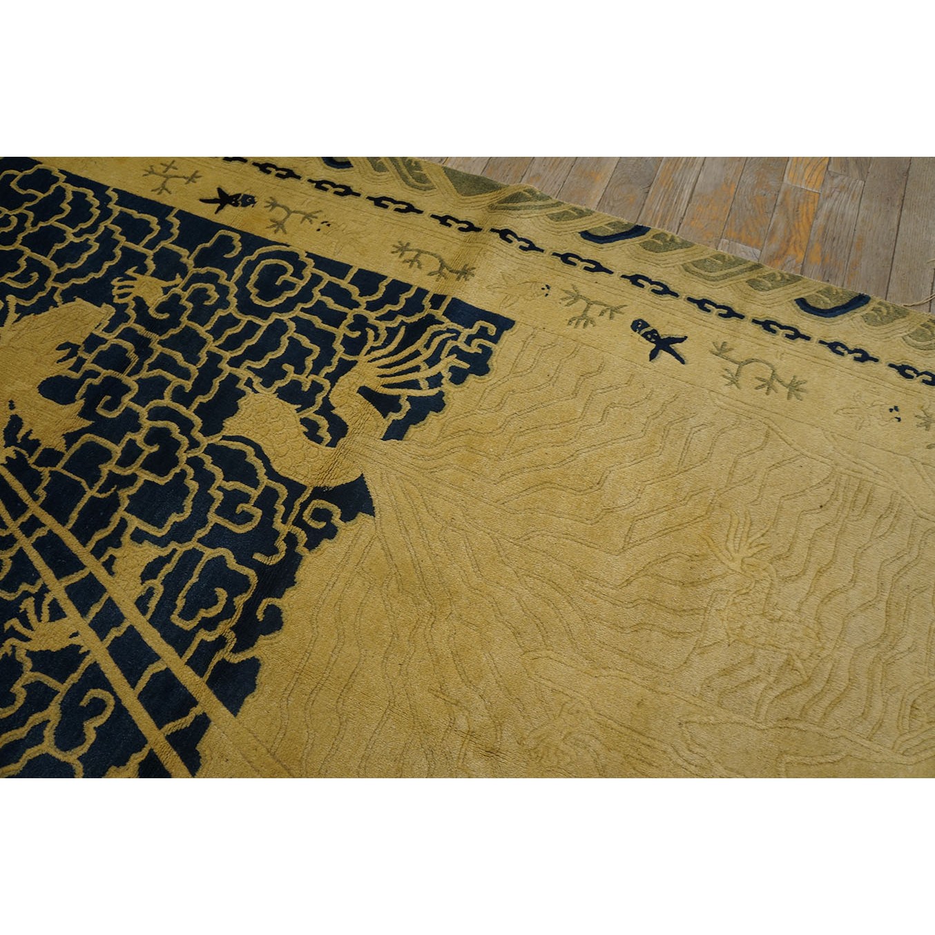 DescriptionChineseCarpets made in China proper. See entries Ningshia, Peking, Art Deco. Chinese - PekingThe commercial Peking carpet is a later 19th century development, begun by importing weaves from Ningshia (see entry) to create and export industry aimed at Western markets. The foundation is cotton and the pile is a good quality carpet wool which takes dyes particularly well. The neat medium weave is in Persian (asymmetric) knots. Designs are strictly Chinese and the whole motif repertoire of Chinese art is employed. Blue and white is the most popular color combination and red is particularly rare. Sizes tend to 9 x 12 and larger, and few small pieces appear. For a short time in the early 1920s Persian designs were woven to capitalize on the death of new Iranian goods. The industry decimated by the Communist Revolution relocated to the Pearl River area. There is a good supply of antique carpets at reasonable prices. | |