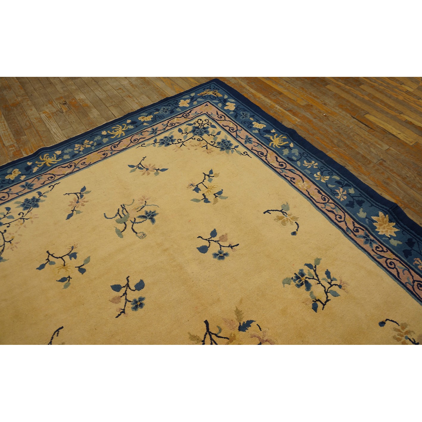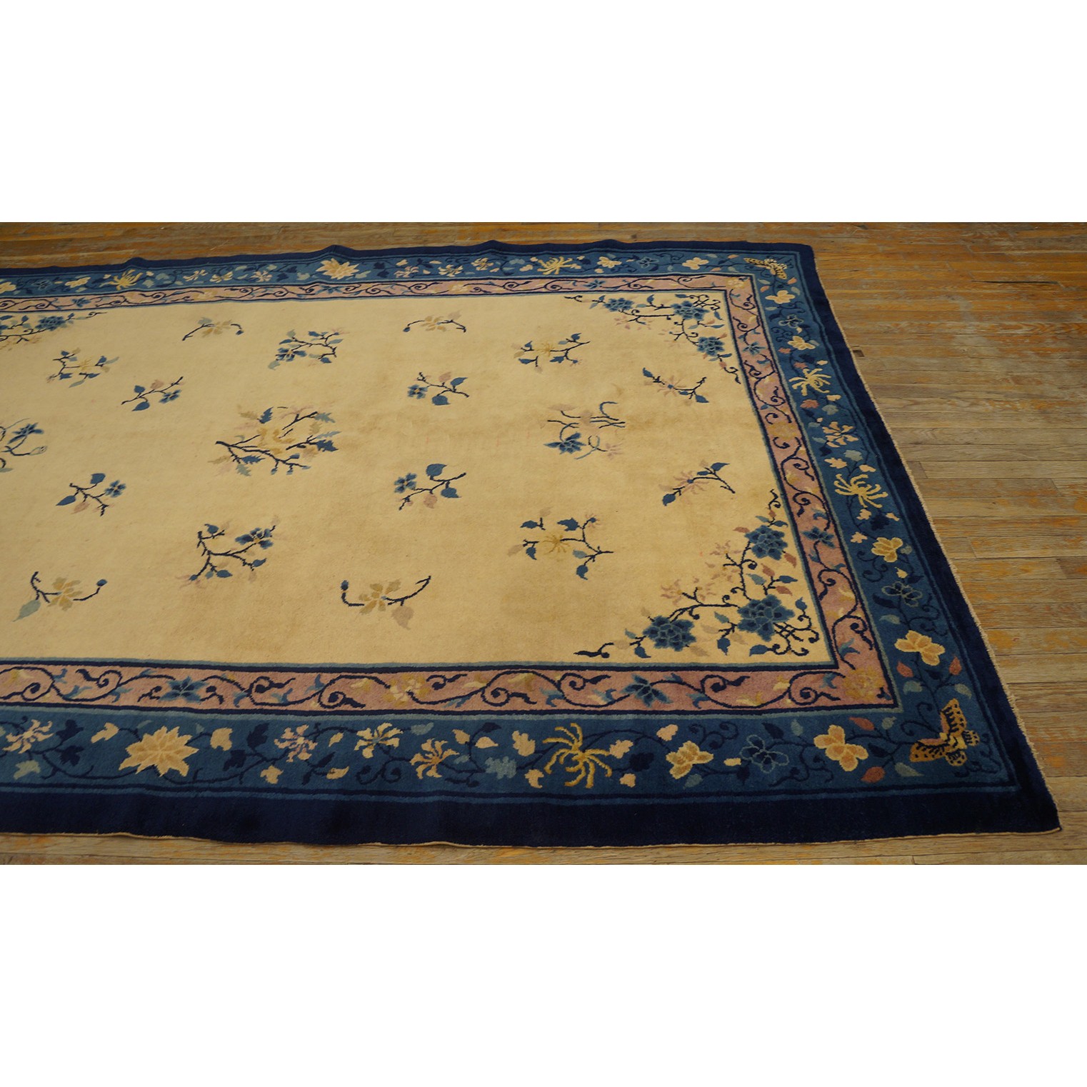 DescriptionChineseCarpets made in China proper. See entries Ningshia, Peking, Art Deco. Chinese - PekingThe commercial Peking carpet is a later 19th century development, begun by importing weaves from Ningshia (see entry) to create and export industry aimed at Western markets. The foundation is cotton and the pile is a good quality carpet wool which takes dyes particularly well. The neat medium weave is in Persian (asymmetric) knots. Designs are strictly Chinese and the whole motif repertoire of Chinese art is employed. Blue and white is the most popular color combination and red is particularly rare. Sizes tend to 9 x 12 and larger, and few small pieces appear. For a short time in the early 1920s Persian designs were woven to capitalize on the death of new Iranian goods. The industry decimated by the Communist Revolution relocated to the Pearl River area. There is a good supply of antique carpets at reasonable prices. | |