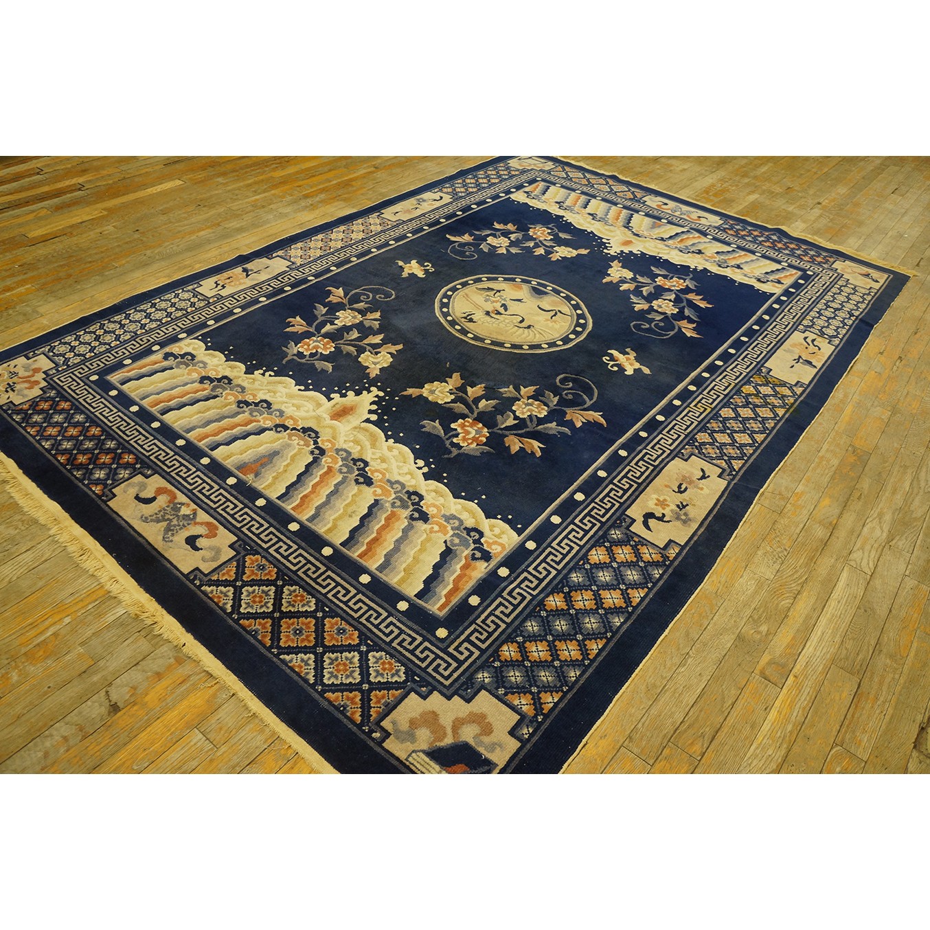 DescriptionChineseCarpets made in China proper. See entries Ningshia, Peking, Art Deco. Chinese - PekingThe commercial Peking carpet is a later 19th century development, begun by importing weaves from Ningshia (see entry) to create and export industry aimed at Western markets. The foundation is cotton and the pile is a good quality carpet wool which takes dyes particularly well. The neat medium weave is in Persian (asymmetric) knots. Designs are strictly Chinese and the whole motif repertoire of Chinese art is employed. Blue and white is the most popular color combination and red is particularly rare. Sizes tend to 9 x 12 and larger, and few small pieces appear. For a short time in the early 1920s Persian designs were woven to capitalize on the death of new Iranian goods. The industry decimated by the Communist Revolution relocated to the Pearl River area. There is a good supply of antique carpets at reasonable prices. | |