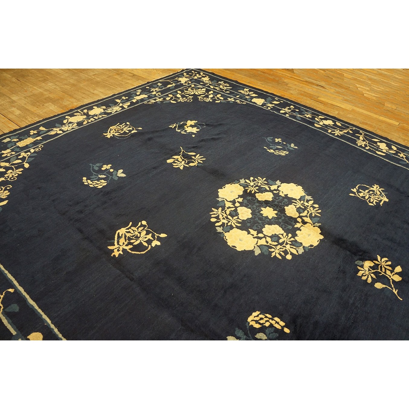 DescriptionChineseCarpets made in China proper. See entries Ningshia, Peking, Art Deco. Chinese - PekingThe commercial Peking carpet is a later 19th century development, begun by importing weaves from Ningshia (see entry) to create and export industry aimed at Western markets. The foundation is cotton and the pile is a good quality carpet wool which takes dyes particularly well. The neat medium weave is in Persian (asymmetric) knots. Designs are strictly Chinese and the whole motif repertoire of Chinese art is employed. Blue and white is the most popular color combination and red is particularly rare. Sizes tend to 9 x 12 and larger, and few small pieces appear. For a short time in the early 1920s Persian designs were woven to capitalize on the death of new Iranian goods. The industry decimated by the Communist Revolution relocated to the Pearl River area. There is a good supply of antique carpets at reasonable prices. | |