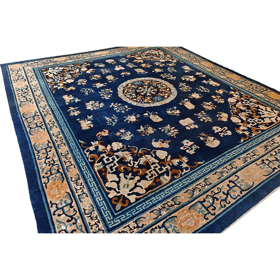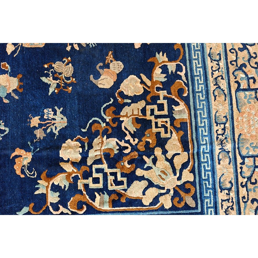 DescriptionChineseCarpets made in China proper. See entries Ningshia, Peking, Art Deco. Chinese - PekingThe commercial Peking carpet is a later 19th century development, begun by importing weaves from Ningshia (see entry) to create and export industry aimed at Western markets. The foundation is cotton and the pile is a good quality carpet wool which takes dyes particularly well. The neat medium weave is in Persian (asymmetric) knots. Designs are strictly Chinese and the whole motif repertoire of Chinese art is employed. Blue and white is the most popular color combination and red is particularly rare. Sizes tend to 9 x 12 and larger, and few small pieces appear. For a short time in the early 1920s Persian designs were woven to capitalize on the death of new Iranian goods. The industry decimated by the Communist Revolution relocated to the Pearl River area. There is a good supply of antique carpets at reasonable prices. | |