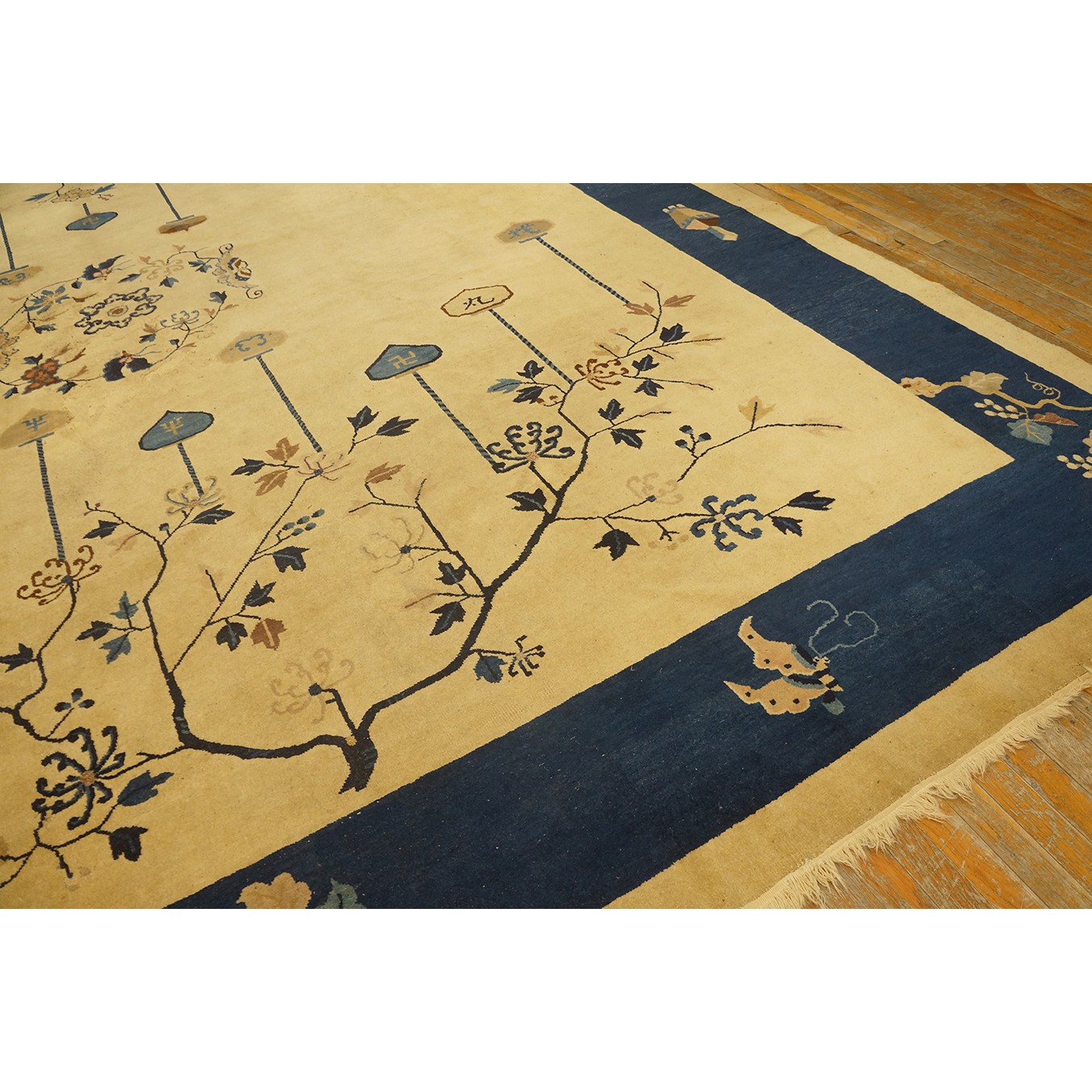 DescriptionChineseCarpets made in China proper. See entries Ningshia, Peking, Art Deco. Chinese - PekingThe commercial Peking carpet is a later 19th century development, begun by importing weaves from Ningshia (see entry) to create and export industry aimed at Western markets. The foundation is cotton and the pile is a good quality carpet wool which takes dyes particularly well. The neat medium weave is in Persian (asymmetric) knots. Designs are strictly Chinese and the whole motif repertoire of Chinese art is employed. Blue and white is the most popular color combination and red is particularly rare. Sizes tend to 9 x 12 and larger, and few small pieces appear. For a short time in the early 1920s Persian designs were woven to capitalize on the death of new Iranian goods. The industry decimated by the Communist Revolution relocated to the Pearl River area. There is a good supply of antique carpets at reasonable prices. | |