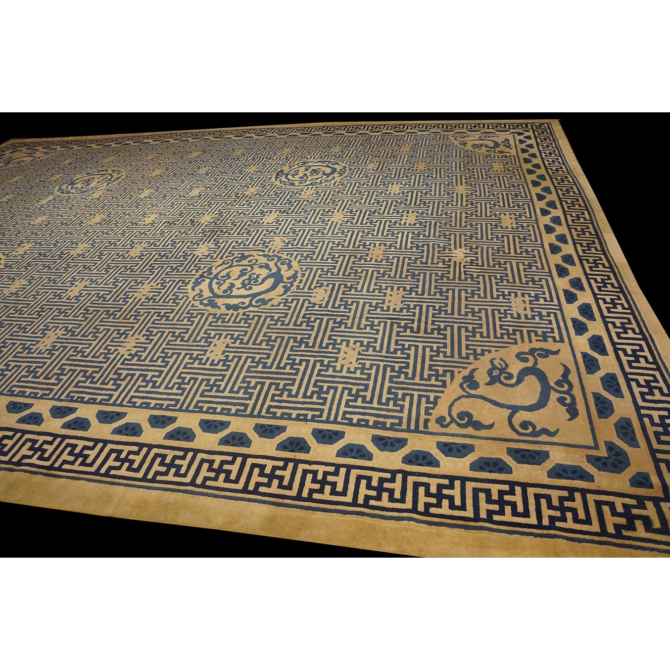DescriptionChineseCarpets made in China proper. See entries Ningshia, Peking, Art Deco. Chinese - PekingThe commercial Peking carpet is a later 19th century development, begun by importing weaves from Ningshia (see entry) to create and export industry aimed at Western markets. The foundation is cotton and the pile is a good quality carpet wool which takes dyes particularly well. The neat medium weave is in Persian (asymmetric) knots. Designs are strictly Chinese and the whole motif repertoire of Chinese art is employed. Blue and white is the most popular color combination and red is particularly rare. Sizes tend to 9 x 12 and larger, and few small pieces appear. For a short time in the early 1920s Persian designs were woven to capitalize on the death of new Iranian goods. The industry decimated by the Communist Revolution relocated to the Pearl River area. There is a good supply of antique carpets at reasonable prices. | |